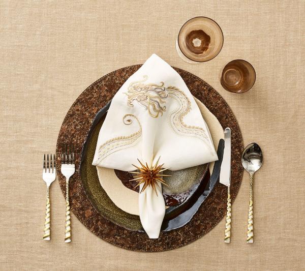 Our Bark placemats are perfect for casual indoor or outdoor entertaining because of their warm, earthy look. They are made to look like tree barks, but with a touch of glamour. This version in brown with gold accents will delight during an autumn harvest gathering.