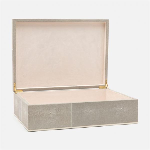Hinged box featuring geometric faux-shagreen panels trimmed with bone-like resin. Sold individually.