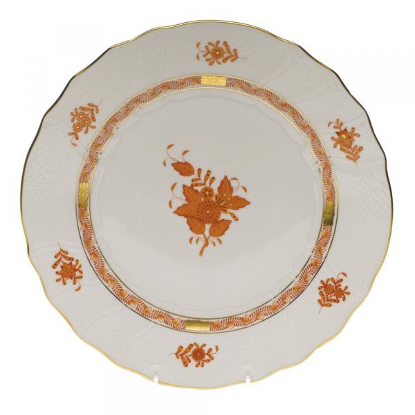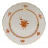 Originally created in 1930 in raspberry coloration for Count Albert Apponyi, the pattern features a center motif of a stylized peony surrounded by a garland of leaves with 24K gold rosettes.