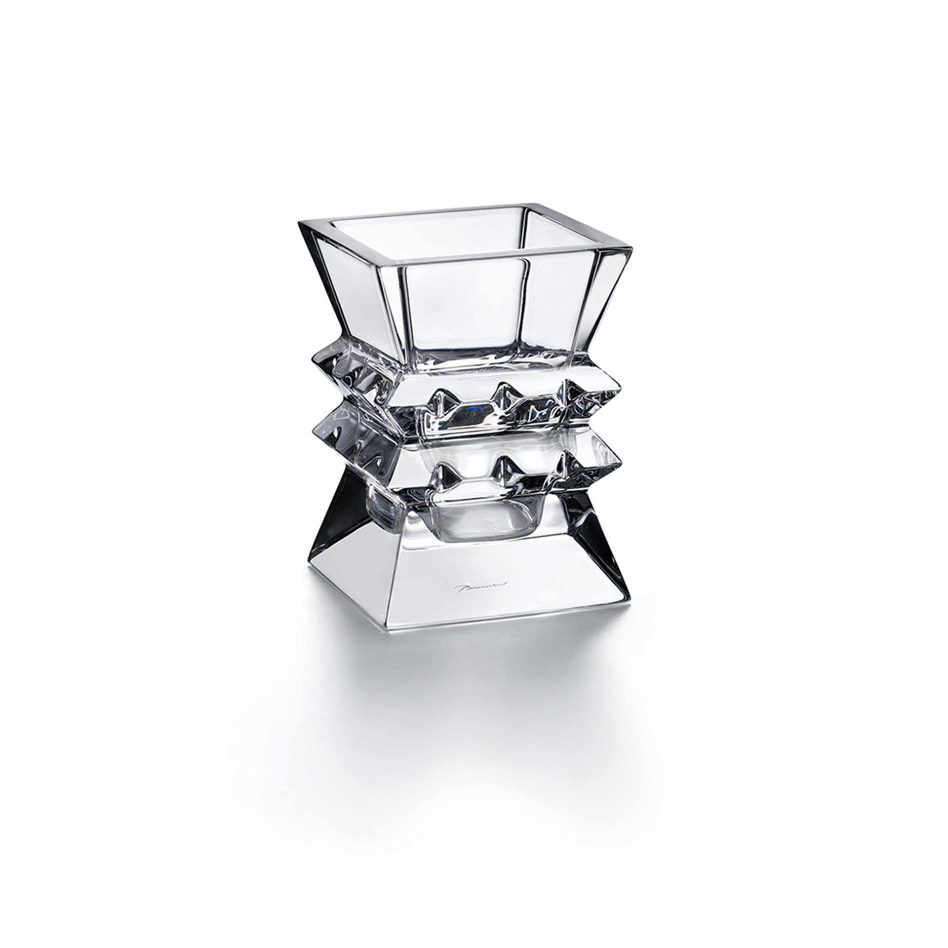 Baccarat’s Clear crystal Columbine vase is a stunningly architectural piece. Two tiers encircle the center of the vase in a thick band of beveled pyramidal structures.