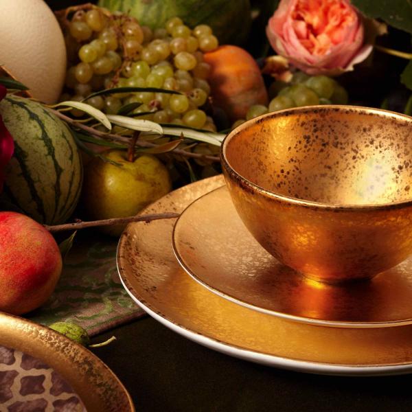 A centuries-old crossroads of trade between East and West, Venice is a place like no other… a singular, floating city reflecting an extraordinary range of cultural influences. The Alchemie de Venise collection is a modern interpretation of the city’s timeless mélange of textures, color, and light. Individual pieces are crafted from fine earthenware and a unique reactive finish incorporating 24K Gold and Platinum.