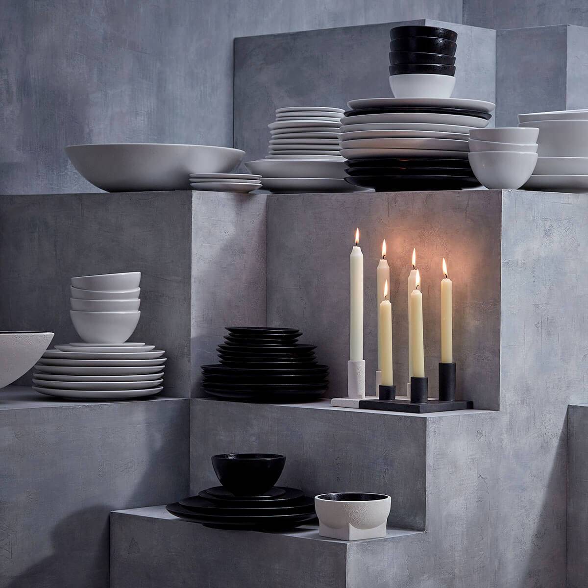 The Alchimie collection possesses a seemingly ancient and luxurious patina that brings a timeless glow to any table setting. Individual pieces are crafted from fine earthenware and enhanced by a unique reactive finish incorporating white, 24K gold, platinum, or black.