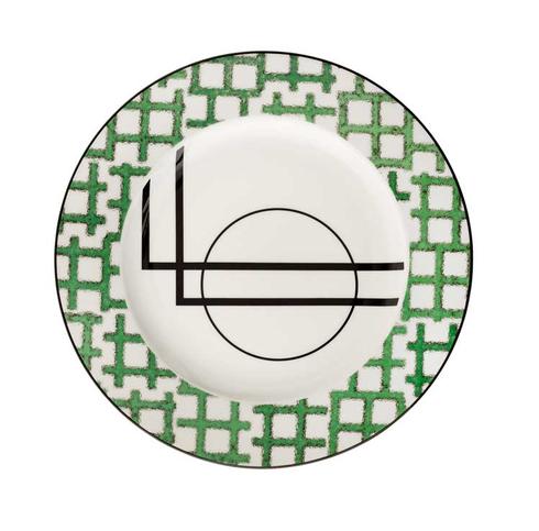 The "Menta" porcelain dinnerware by Alberto Pinto is adorned with a modern and abstract design. It plays with graphic shapes such as circles and right angles. On the rim is a green design reminiscent of a maze. You can choose between six different patterns and thus play with different designs.