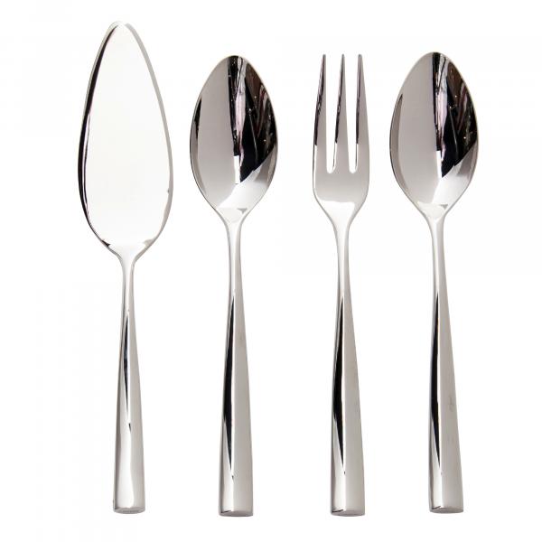 Includes 1 serving fork, 1 serving spoon, 1 cake server, and 1 pierced serving spoon