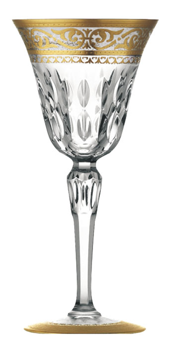 The simple geometric lines of the Stella collection give Stella an air that is both modern and delicate and the gold rim heightens its sophistication. The stars lend these gilded "Stella" glasses their name. Their zigzag shape and dinner-table sparkle testify to a particularly inspired idea from the designers of Saint-Louis Crystal. The design fans out from the foot of the glass – and, as if to underline this motion, the bowls of the "Stella" glasses also open up wide.