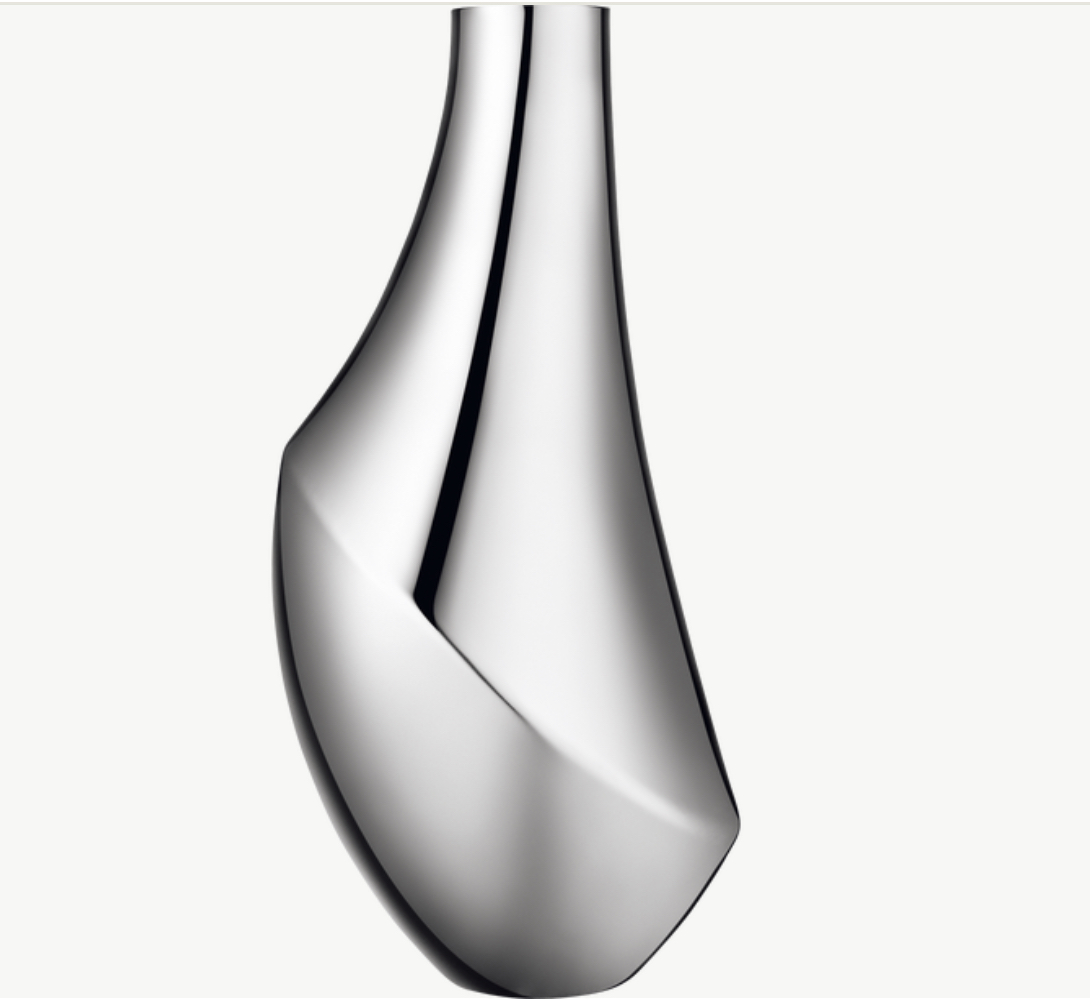 The vase mixes curves with slenderness: a contrast often found in nature. The shape is unexpected rather than symmetrical; its asymmetry is also a feature borrowed from nature. The strong angles and gentle curves make the vase a striking decorative piece for any surface. The mirrored surface reflects the flowers, creating a dramatic effect that accentuates the natural colour and texture of the flowers. Together, the vase and its contents create a totally unique display that changes with each flower arrangement. An eye-catching combination of nature and craftsmanship.