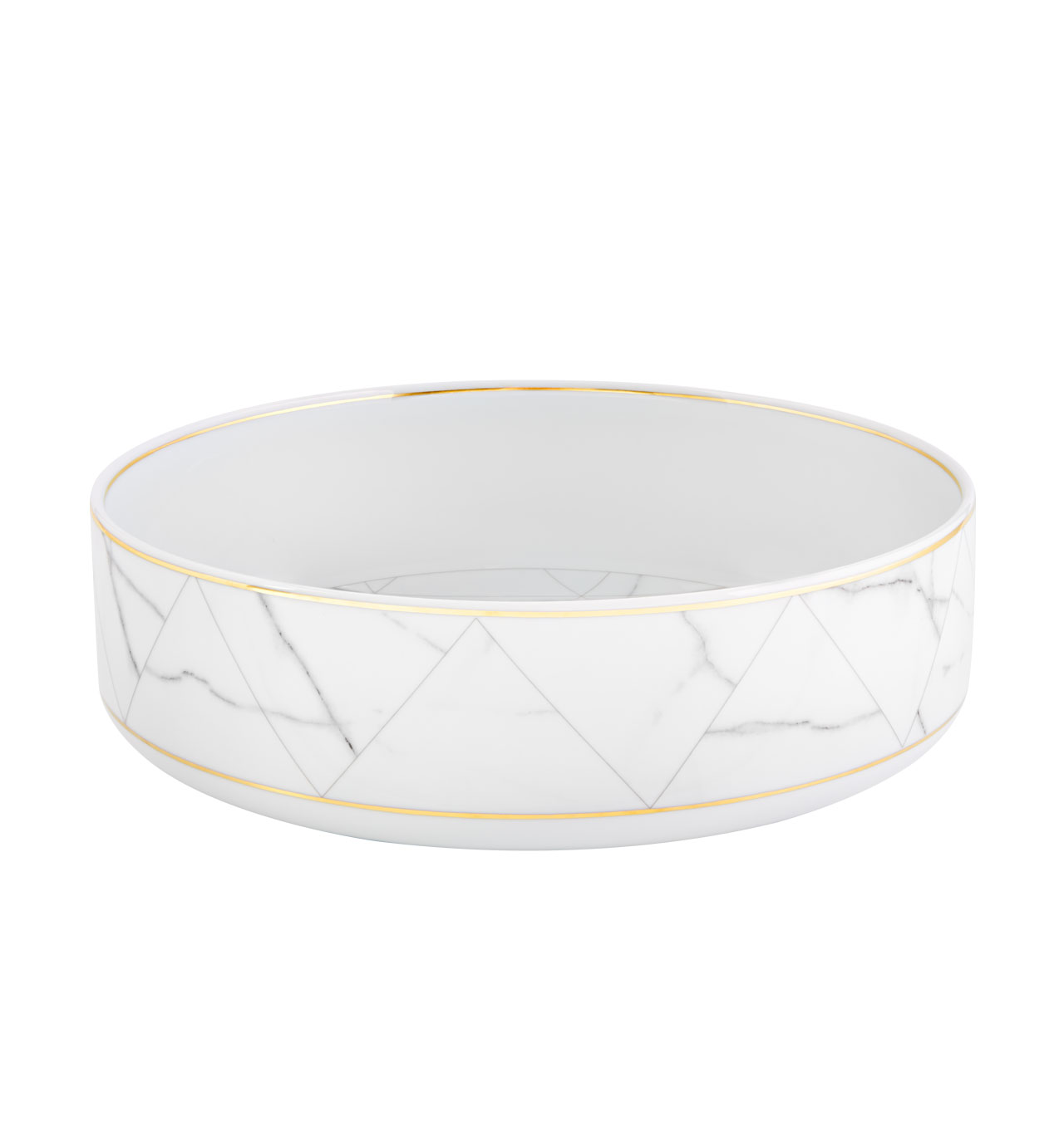 The combination between porcelain and drawings inspired by the noble marble of Carrara, a very refined, geometric approach, creates the illusion that each piece of the set is interchangeable.