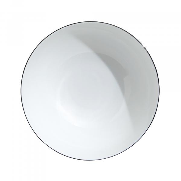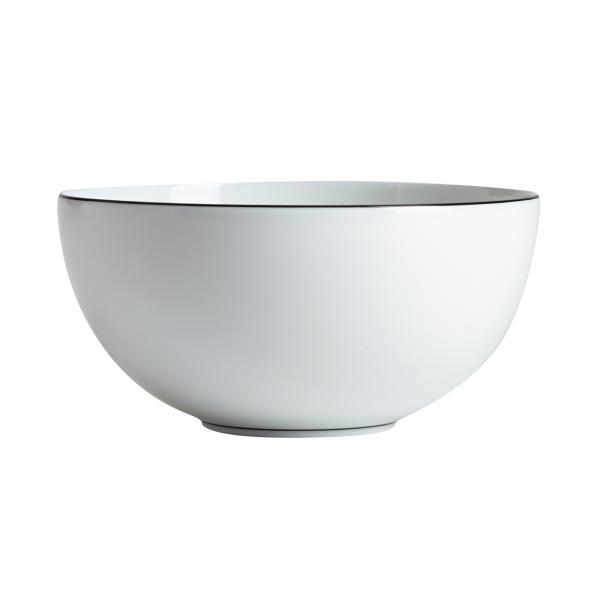 The edges of this elegant dinnerware are detailed with the slightest hint of black for a dramatic effect. The elegant pieces can be used alone to bring understated wit to the table or dressed up by mixing in with patterns.