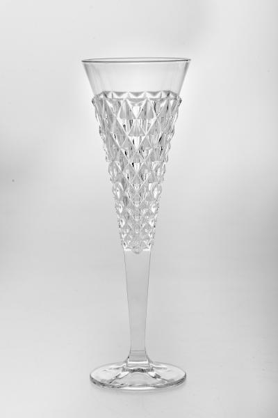 The glasses are quite massive, with thick decorated walls, on a high faceted leg.