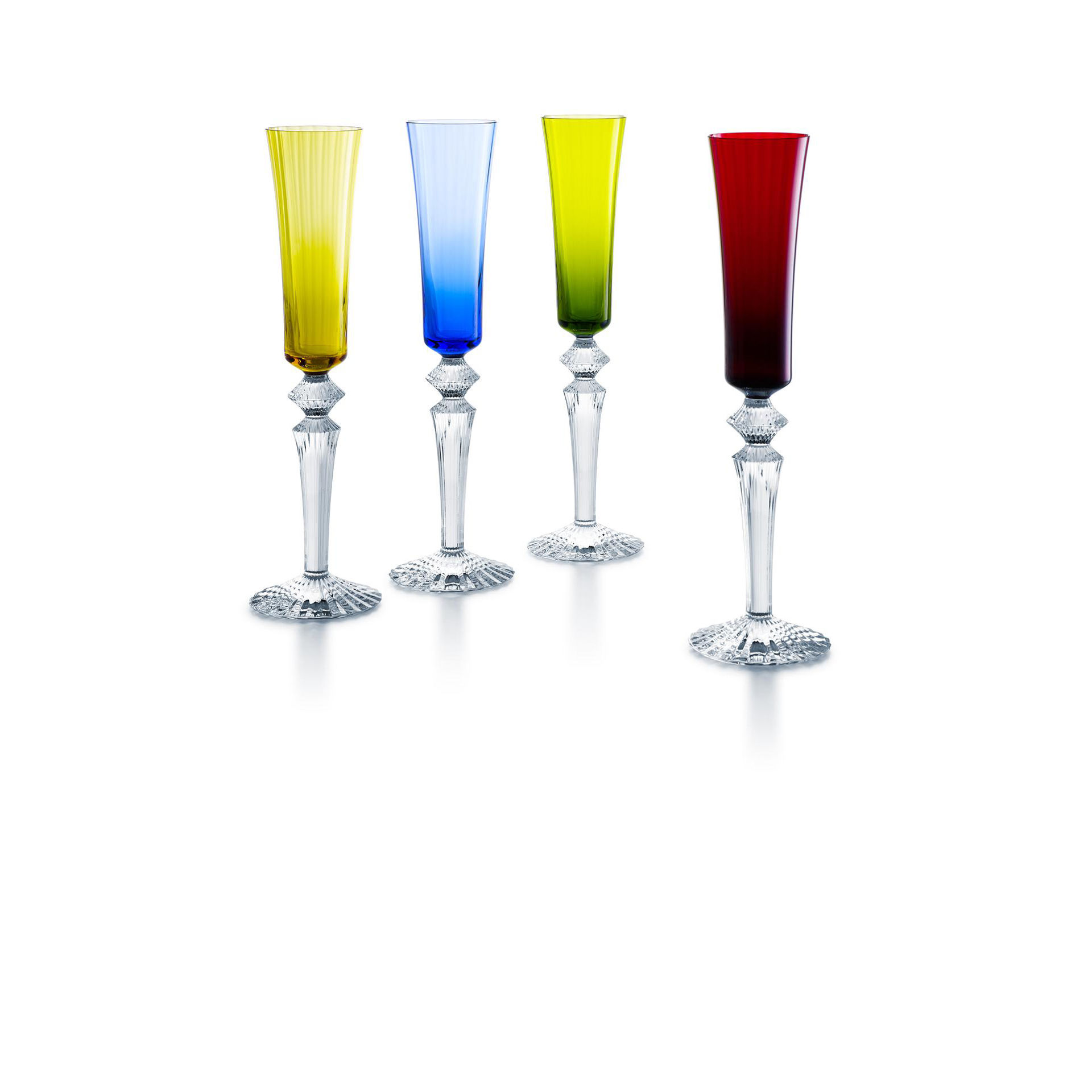 A set of 4 Flutissimo champagne flutes: blue, moss, red and amber, Capacity: 5.75 oz , Height: 11.42"