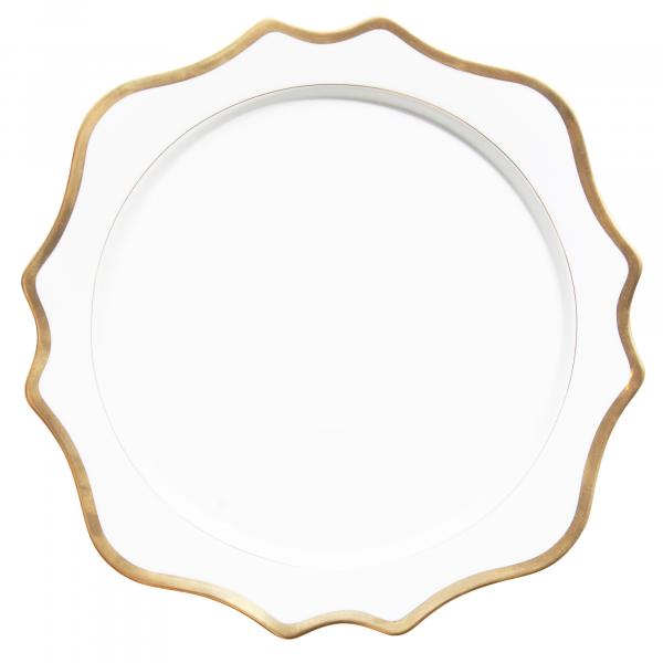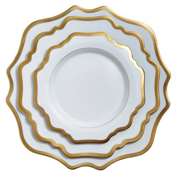 Defined by graceful silhouettes and hand-painted gold rims, this plate from Anna Weatherly adds a charming element to the table. Pair with more lavish pieces from Anna’s assortment, or more simple accessories for an understated elegance.