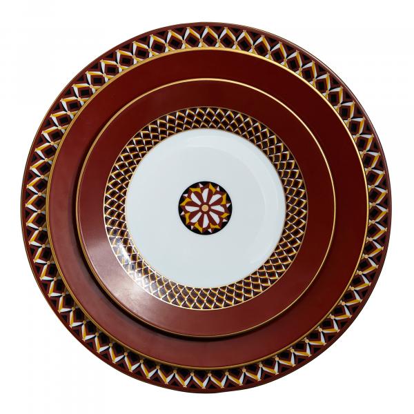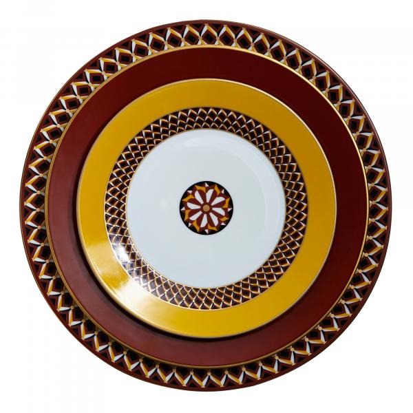 Designed by Suzanne Tucker, the San Marco collection combines rich hues with geometric patterns. This plate will add a pop of color and timeless opulence to your table.