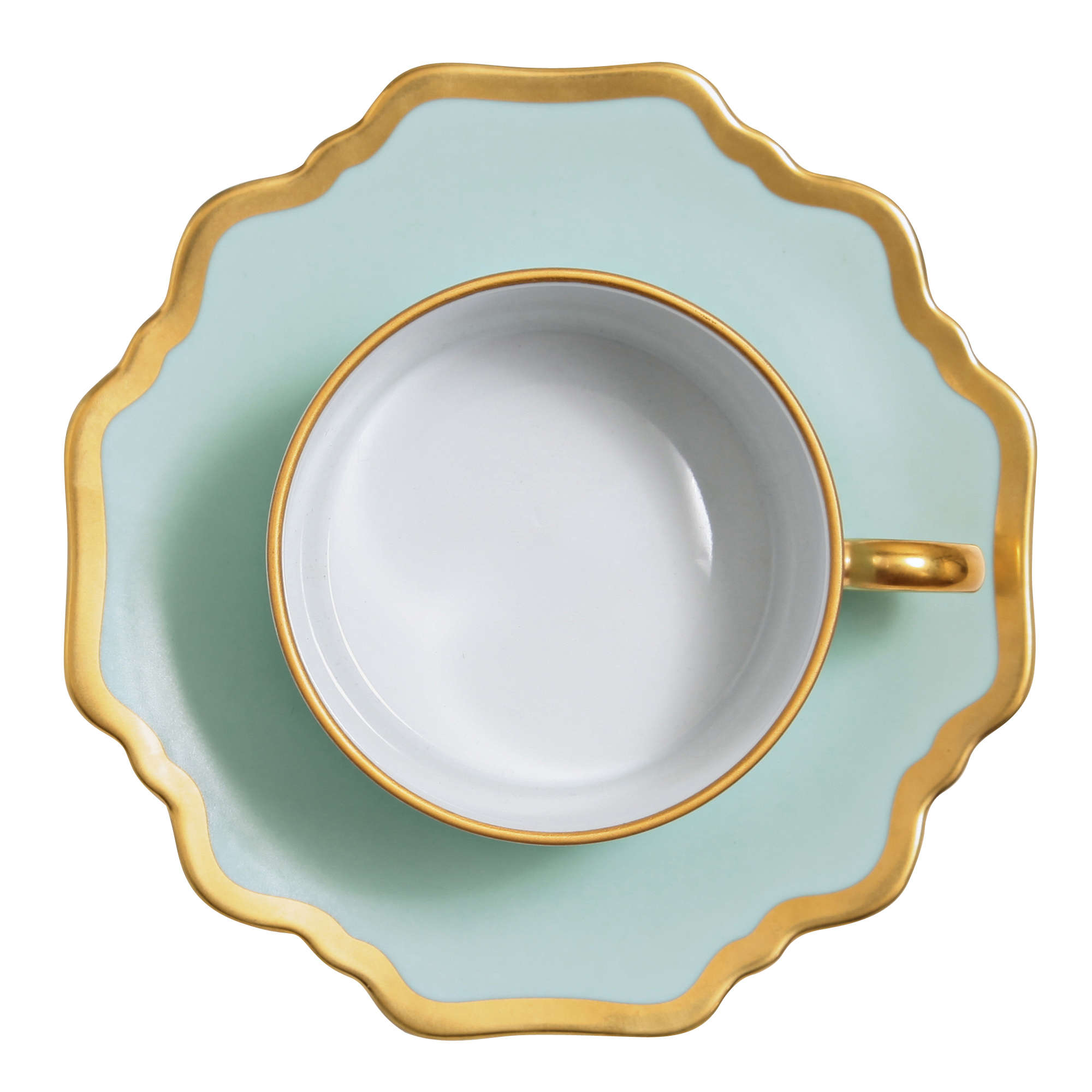 With a lovely aqua green border and a gold band, this collection will add a striking element of design and color to a well-set table. Pair with more lavish pieces from Anna’s assortment, or more simple accessories for an understated elegance.