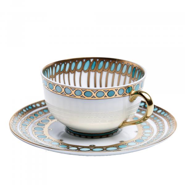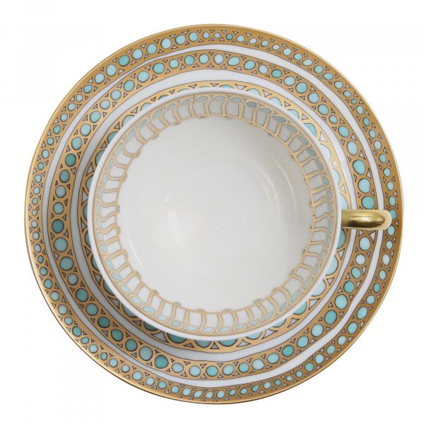 The Syracuse pattern was inspired by the ancient Greek city of Syracuse and the waters of the Ionian Sea. The metallic accents and rich tones make it a dazzling addition to any table.