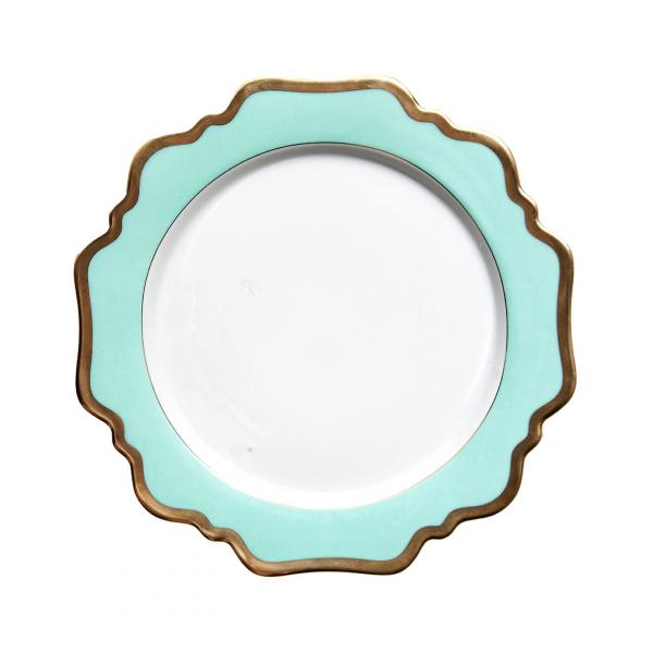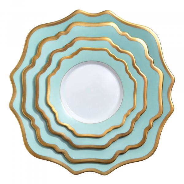With a lovely aqua green border and a gold band, this collection will add a striking element of design and color to a well-set table. Pair with more lavish pieces from Anna’s assortment, or more simple accessories for an understated elegance.
