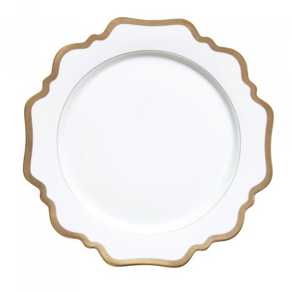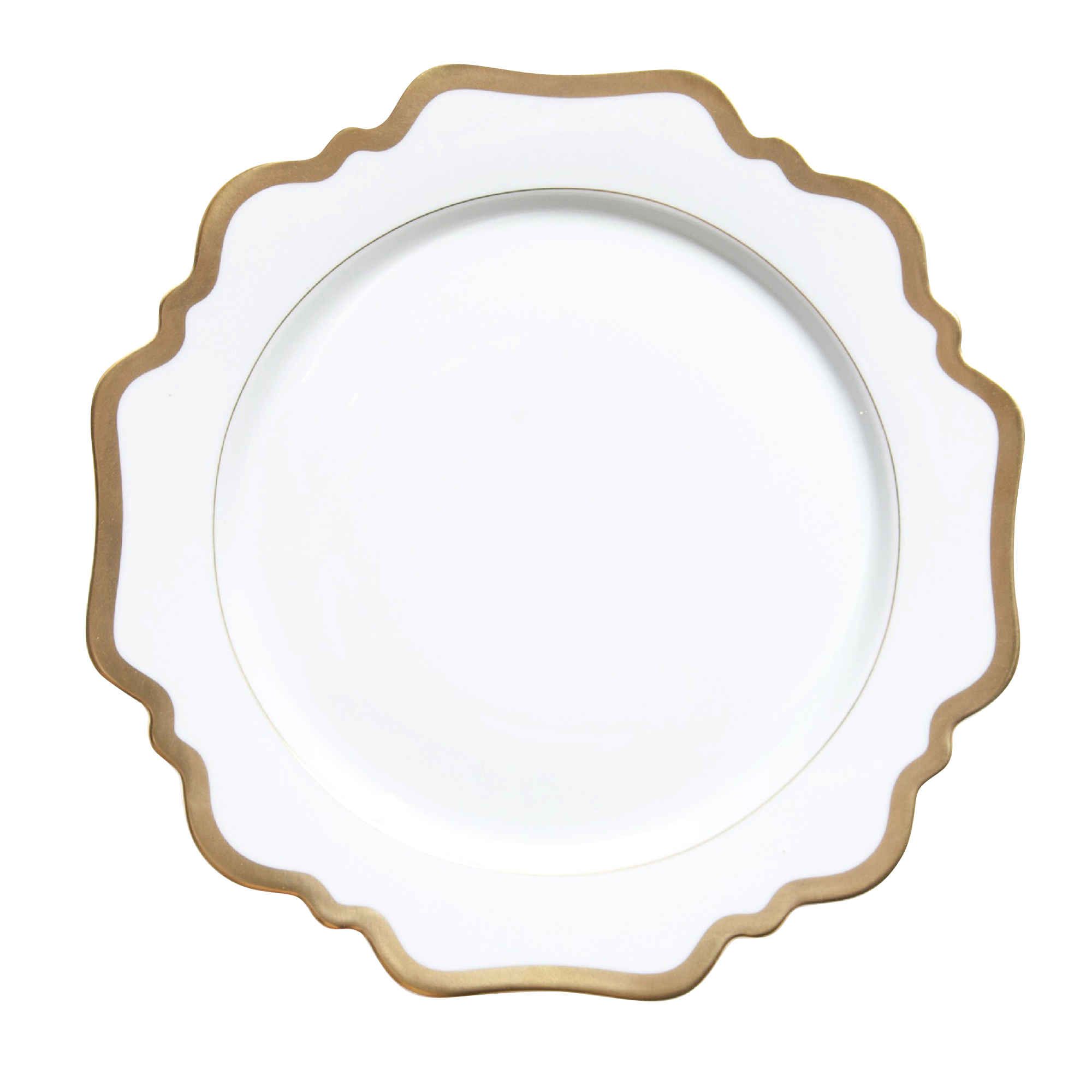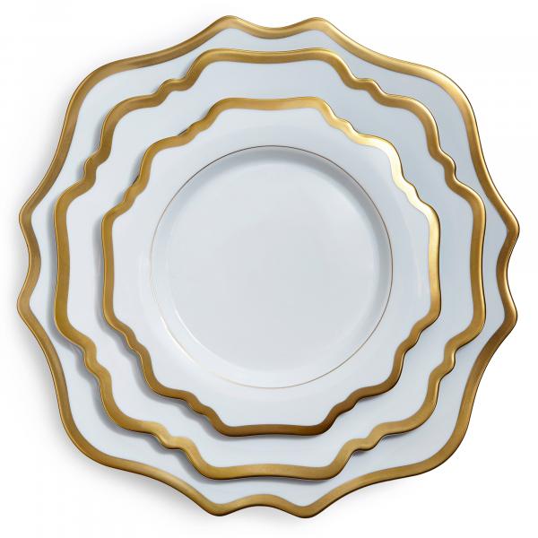 Defined by graceful silhouettes and hand-painted gold rims, this plate from Anna Weatherly adds a charming element to the table. Pair with more lavish pieces from Anna’s assortment, or more simple accessories for an understated elegance.