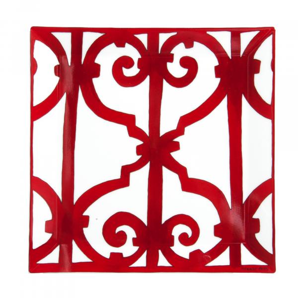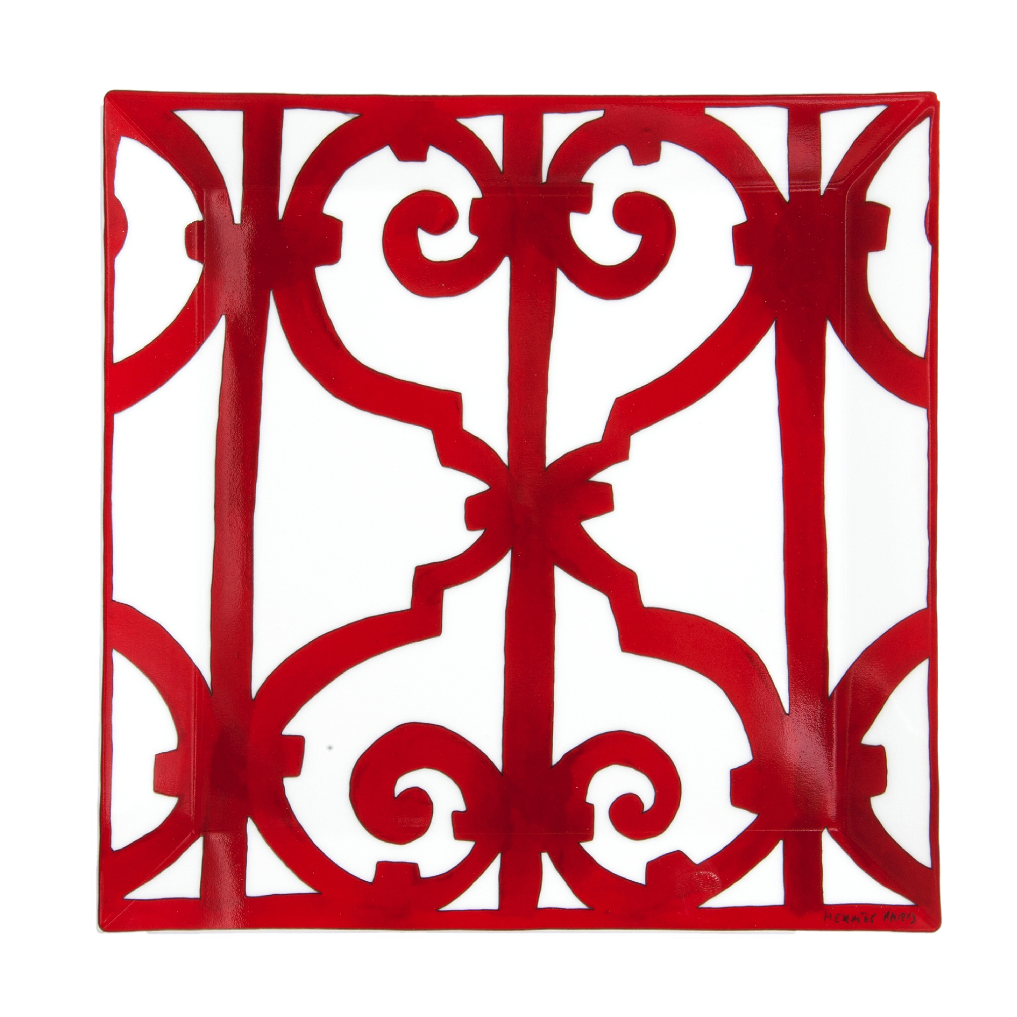 Graphic and bold, the scenery recalls the ironwork of Andalusian towns. The sturdiness of the drawing, the vitality of the red and the wealth and variety of the pieces make it a noble table service.
