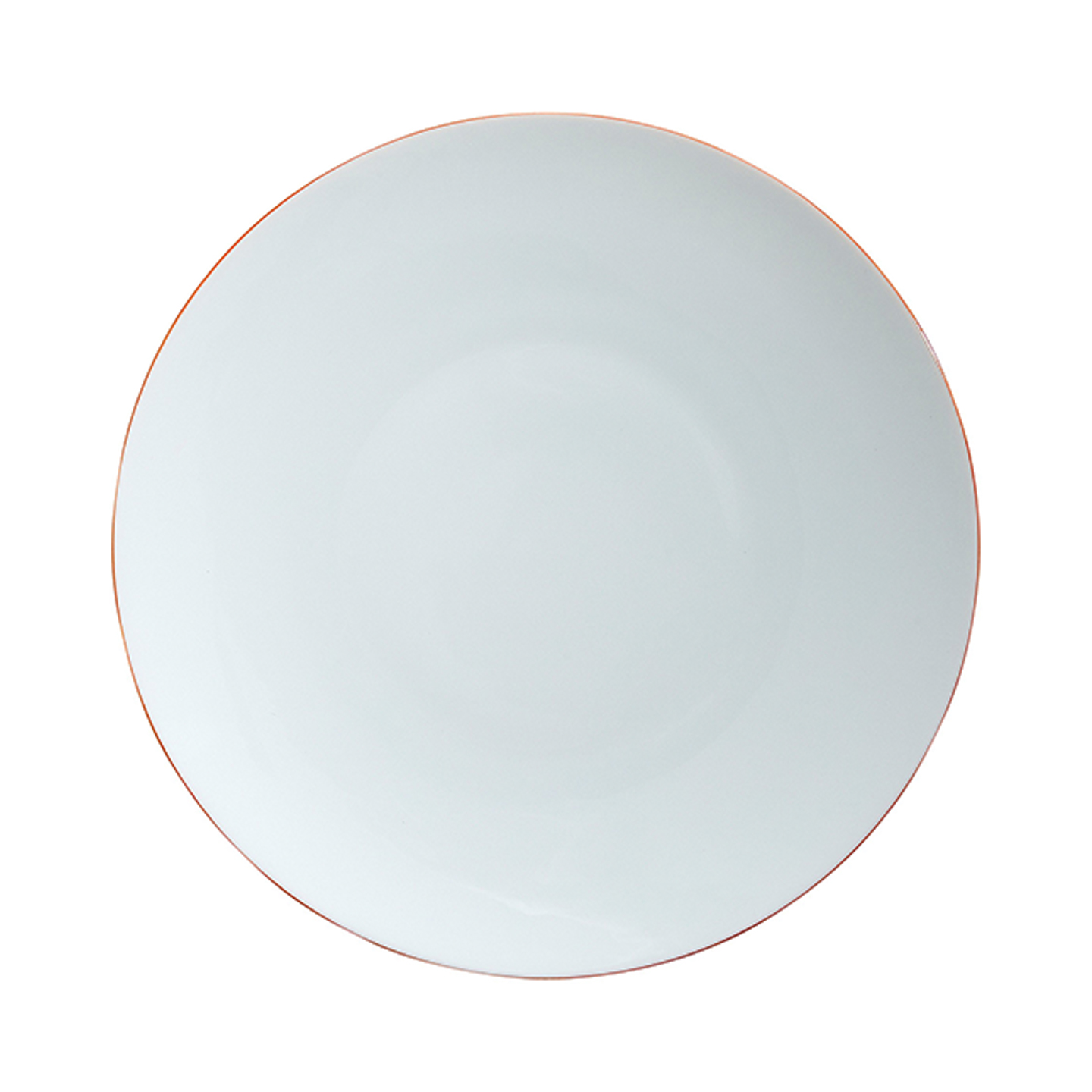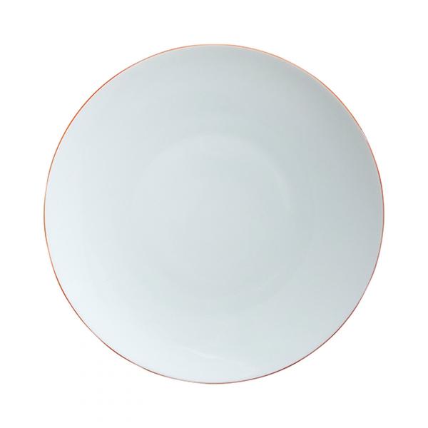 The edges of this elegant dinnerware are detailed with the slightest hint of orange for a dramatic effect. The elegant pieces can be used alone to bring understated wit to the table or dressed up by mixing in with patterns.