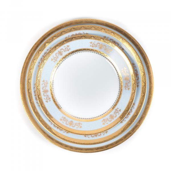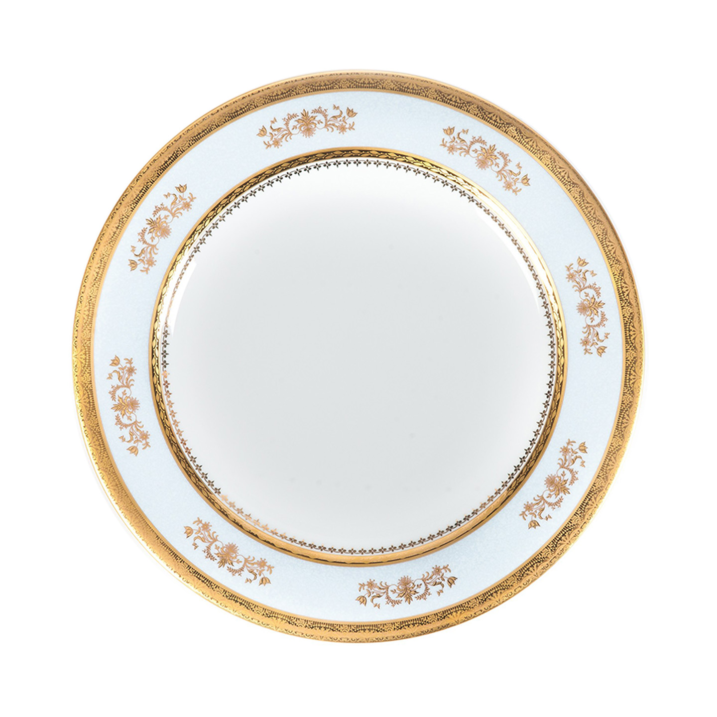 The Musée d’Orsay in Paris lent its Beaux Arts elegance to this porcelain dinnerware, meticulously hand decorated with gold floral scrolls, swags and filigrees inspired by its historic architecture. Glazed blue rims border the pristine white Limoges porcelain and accentuate the lustrous gilding. Master artisans handcraft the collection at the workshops of Deshoulières, makers of fine dinnerware since 1826.