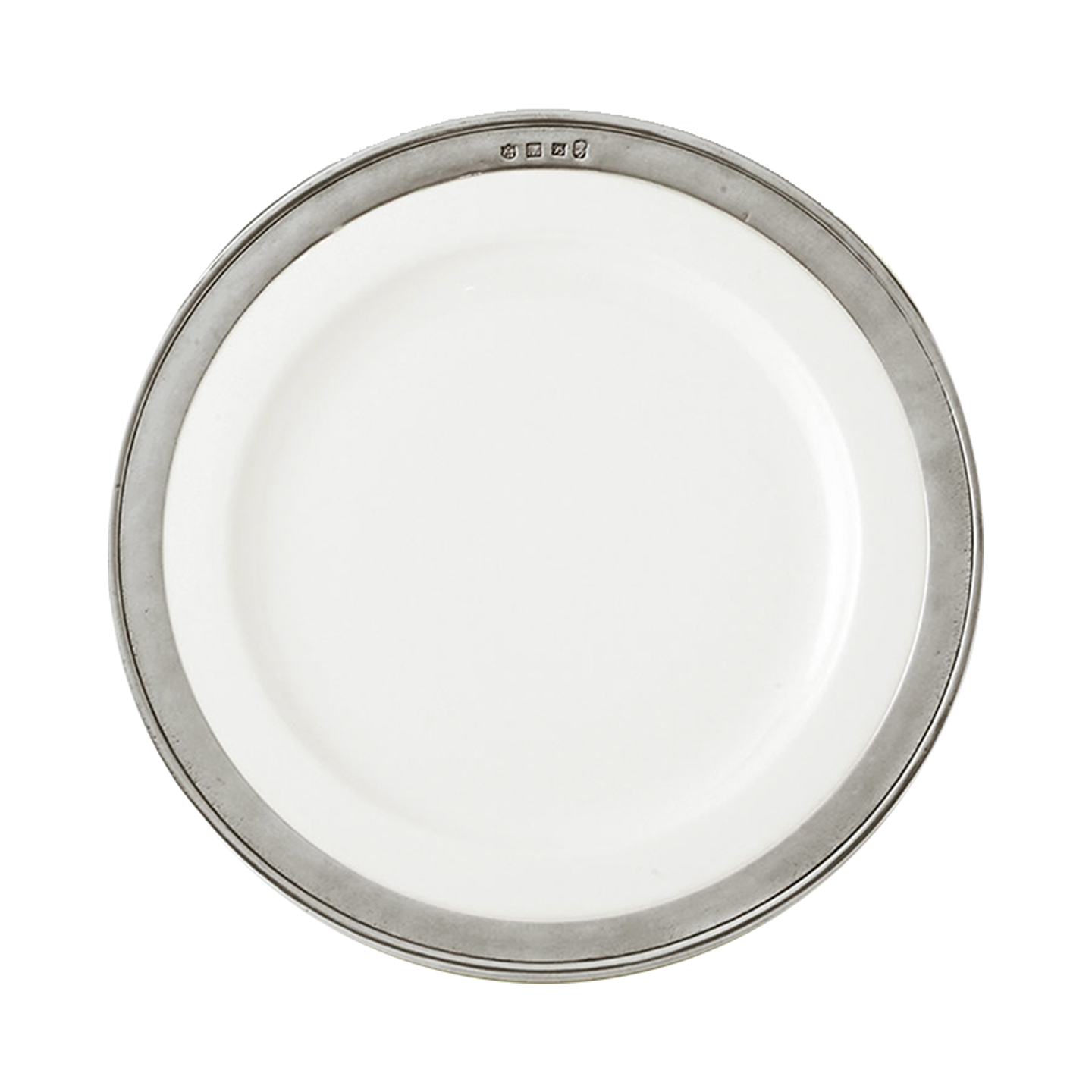 This is a white ceramic dinner plate with a lovely pewter rim. It will create a picture perfect table setting.
