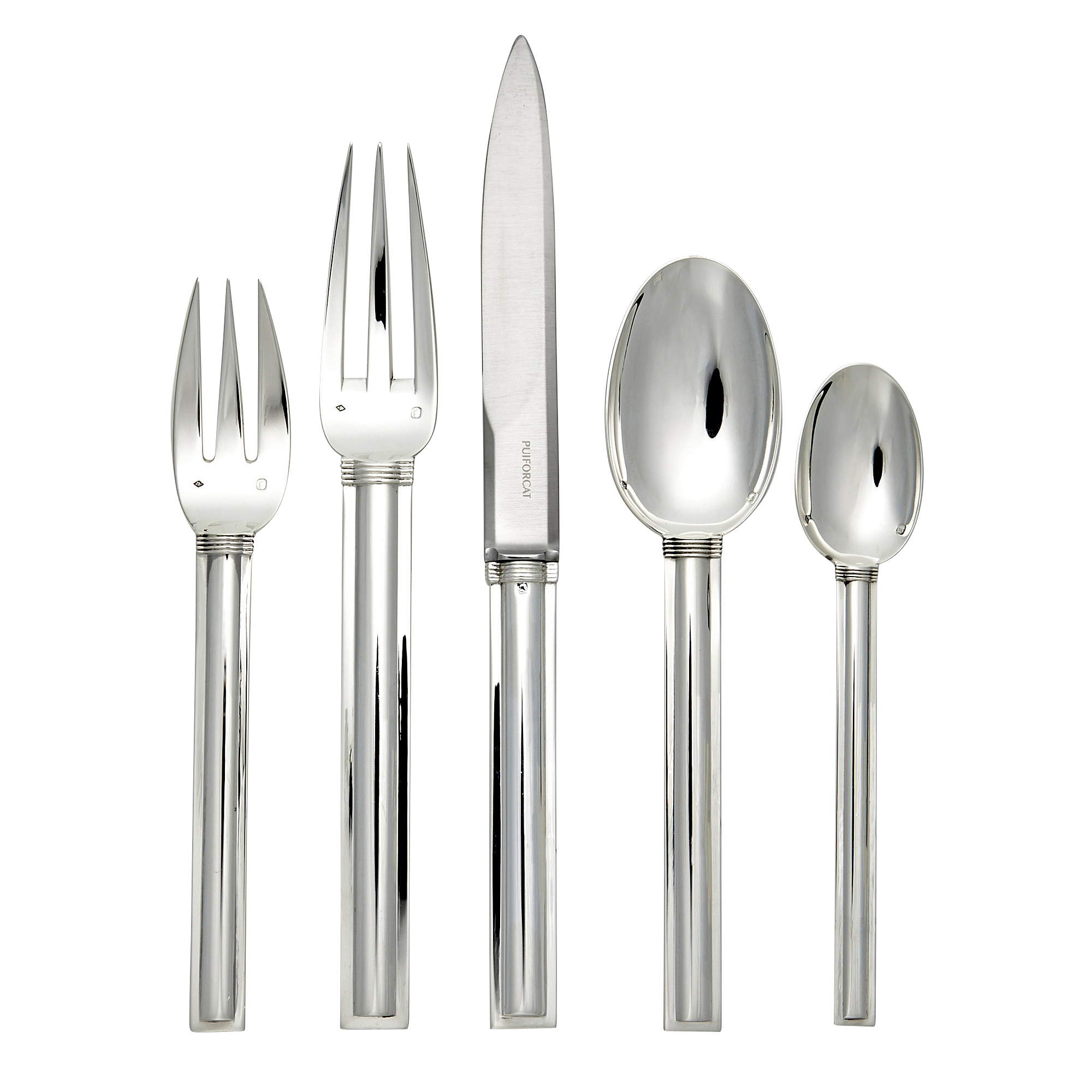 Created by Jean Puiforcat in 1928, this sterling silver flatware features five rings at the top of its fluted handle. A benchmark for connoisseurs, this collection is renowned for the perfection of its architecture that evokes the facade of Hôtel Martinez in Cannes. Jean Puiforcat chose this collection for his own wedding.