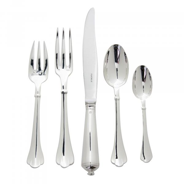 Produced from a late 17th century drawing, this classic silver-plated flatware exemplifies simplicity yet is also extremely modern. It features a spearhead or "rat-tail" reinforcement on the tine of the fork and bowl of the spoon. Meanwhile, the knife design is reminiscent of the rounded form of the old hunting knife, with its curved blade, round handle and stud on the end. Cardinal is the silver-plated version of the Richelieu flatware.