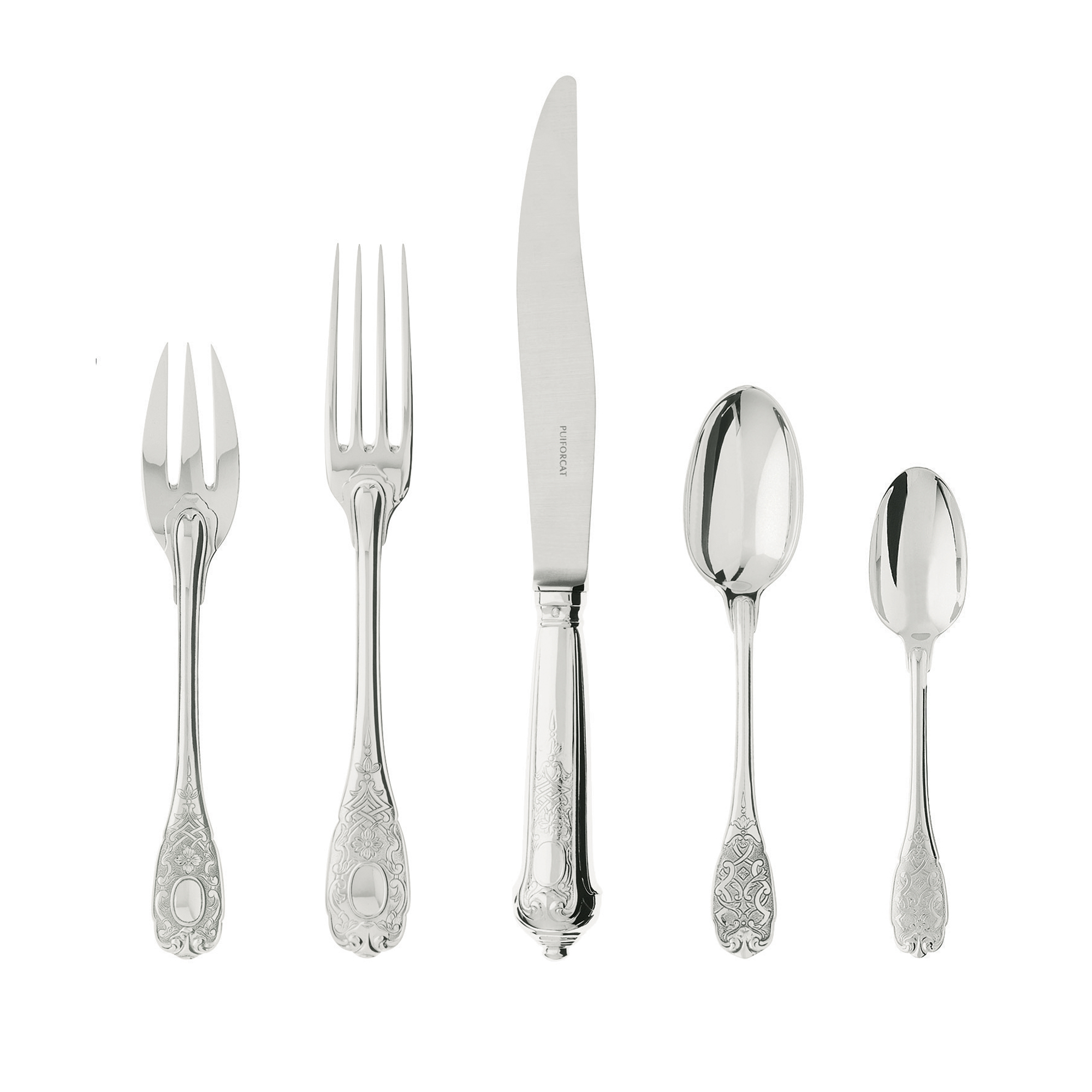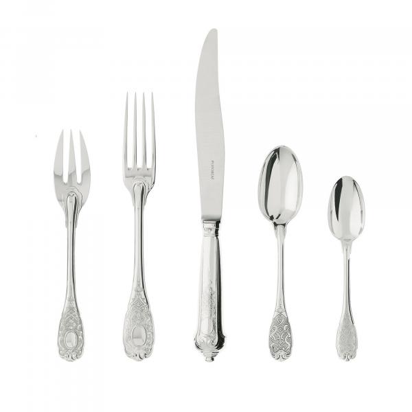 This sterling silver reproduction of an early 18th century Regency design is a masterpiece of French silver work. The design on the handle requires careful chasing and finishing by hand using traditional techniques in order to create its characteristic contours. This cutlery, chosen by the French presidency at the end of the 1940s for the tables at the Elysée Palace, is also available upon request in gold gilt finish.