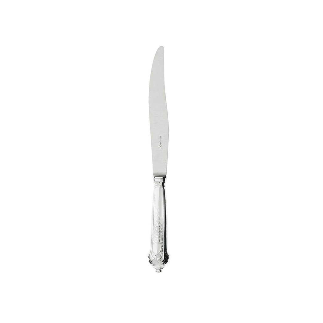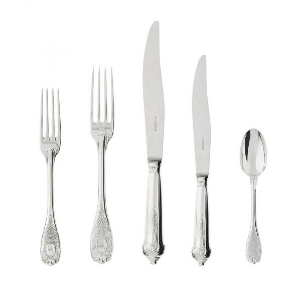 This sterling silver reproduction of an early 18th century Regency design is a masterpiece of French silver work. The design on the handle requires careful chasing and finishing by hand using traditional techniques in order to create its characteristic contours. This cutlery, chosen by the French presidency at the end of the 1940s for the tables at the Elysée Palace, is also available upon request in gold gilt finish.