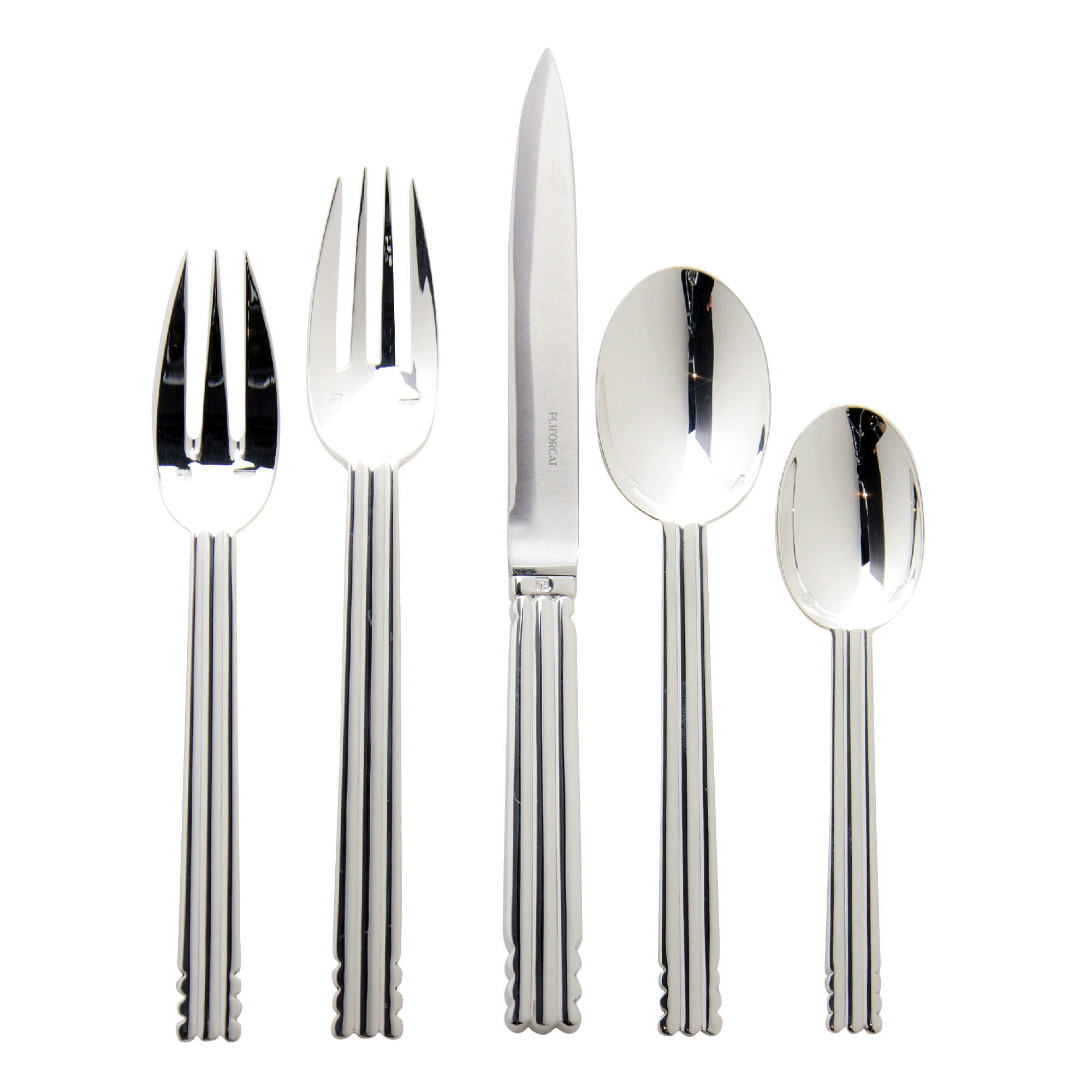 This bold silver-plated cutlery is inspired by a Jean Puiforcat design. Its strong personality owes to the powerful architecture of its straight fluted lines that are softened by the triple lobe featured at the end of the handle.