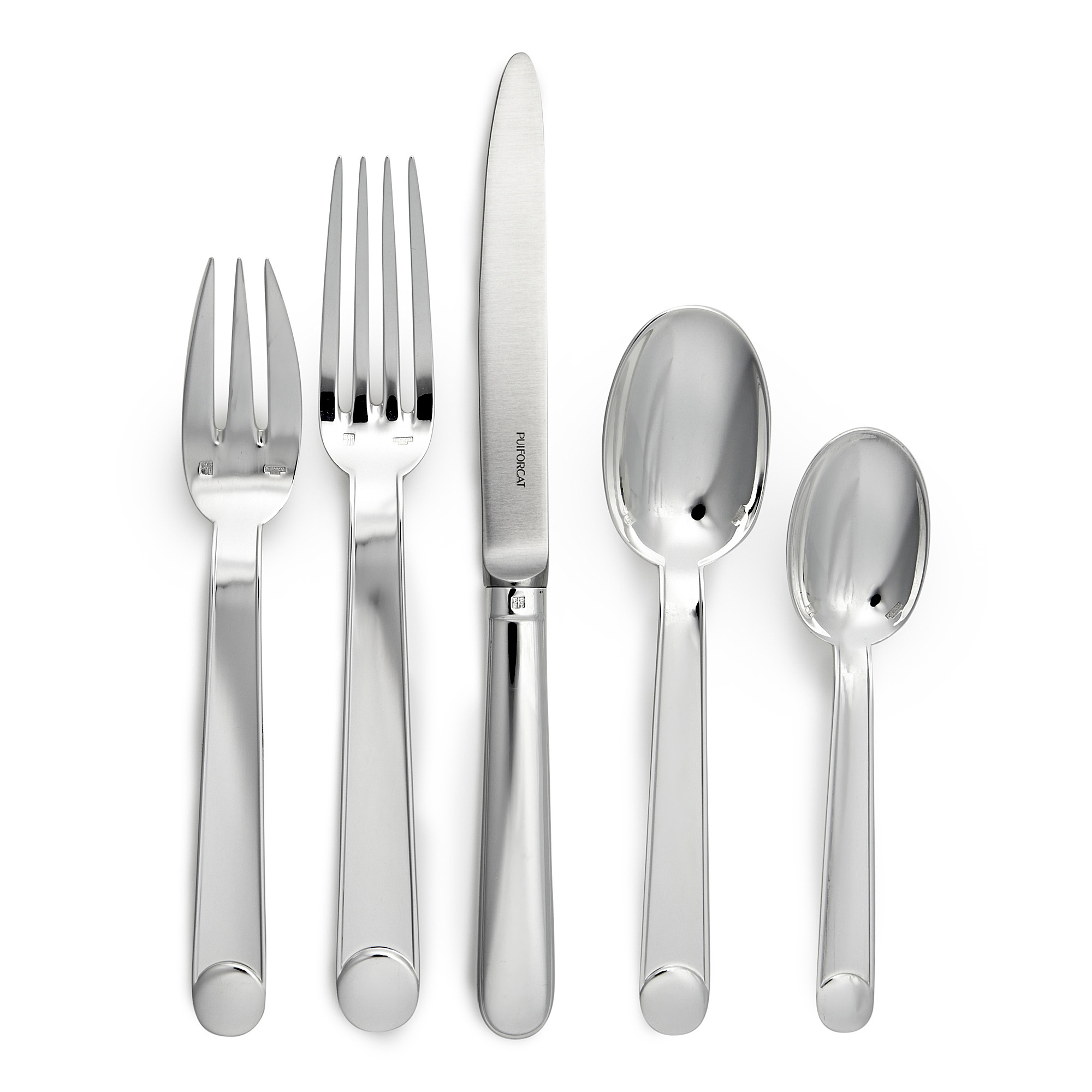 Designed in 1934, this flatware was chosen for one of the restaurants on the eponymous ocean liner that linked New York to Le Havre. The pure forms and perfect geometry of this silver-plated model showcase Jean Puiforcat's talent and make it a timeless design. The disc at the end of the handle may be engraved to customize this cutlery set.