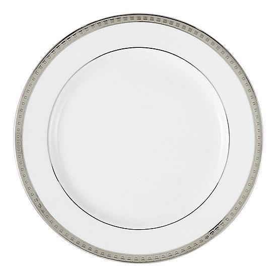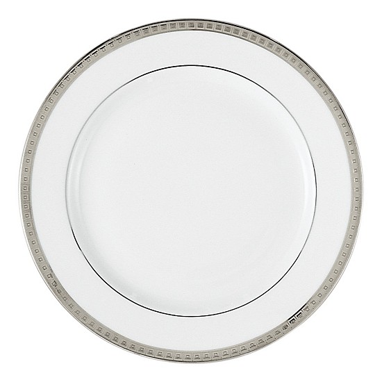 Beautiful, white Limoges porcelain with a dynamic platinum border, the geometric motif of the Athena collection creates a dimensional and graphic appearance. Also available with gold border.
