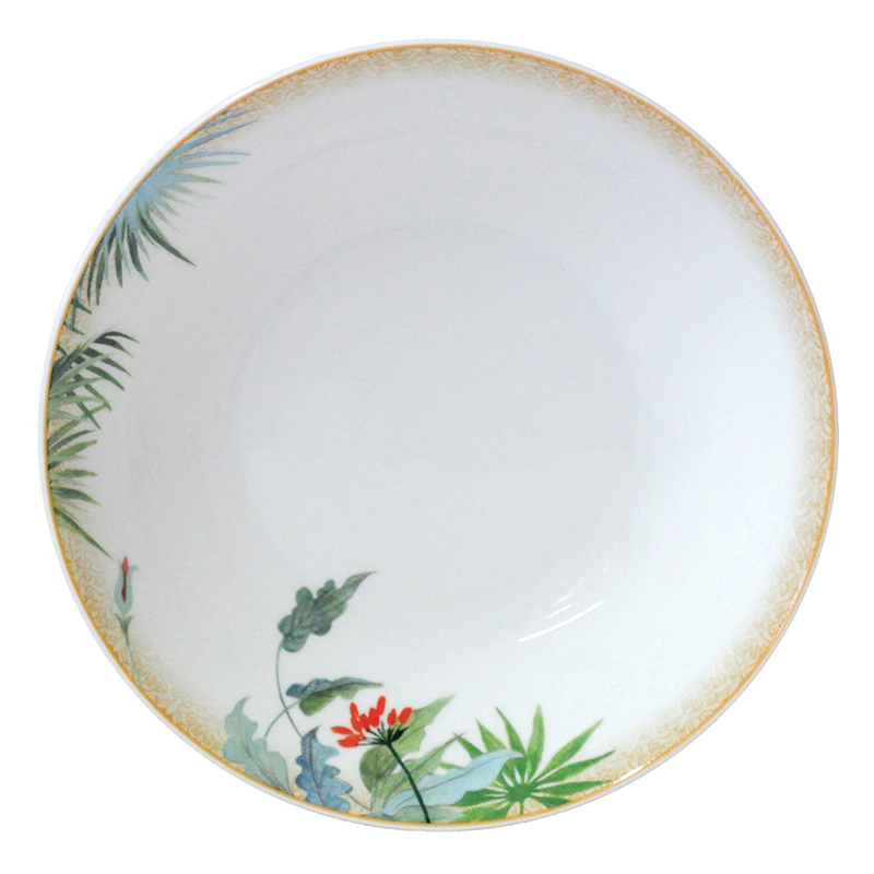A lively design that recalls Florida in the 1950’s. The Tropiques collection is skillfully decorated and features its own individual cast of exotic animals and a beautiful mix of tropical flowers and plants. The soup plate can be used for a simple salad or for a fruit cobbler.