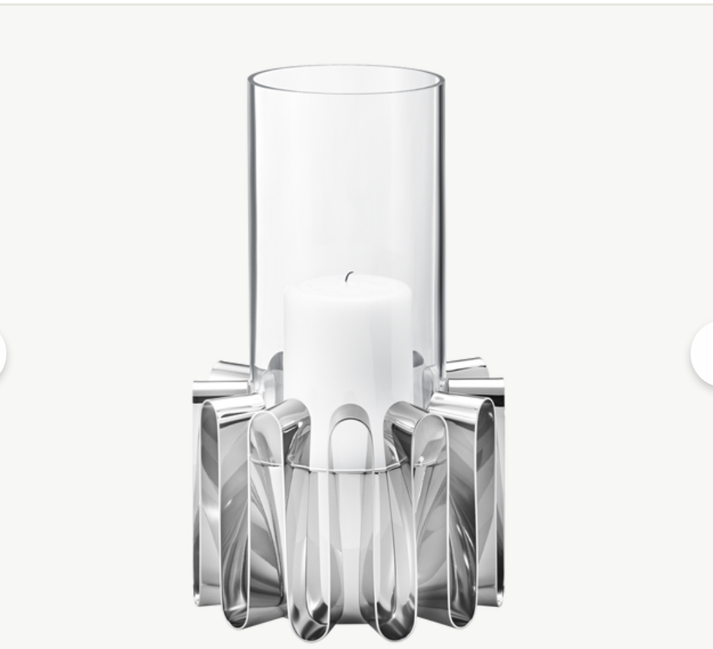 Bring a sense of the drama of the ocean to your terrace or garden with the FREQUENCY hurricane lantern. Inspired by the movement of waves and the way they capture light, the lantern beautifully encases a glass column shade in a circle of stainless steel ribbons, expertly shaped into an undulating fluid form. The high shine surface of the steel reflects the candle light inside, creating an impression of movement that is almost magical. American born Kelly Wearstler approached her FREQUENCY collection for Georg Jensen with a desire to reflect both the raw power of the Californian coast and the timeless minimal aesthetic for which Georg Jensen is famed. The result has a sculptural quality that is both dramatic and warm, yet it also possesses a true feeling of lightness and modernity. The FREQUENCY hurricane lantern consists of a handmade glass shade held in a mirror polished stainless steel case. The glass is frost proof and the lantern is suitable for outside use.