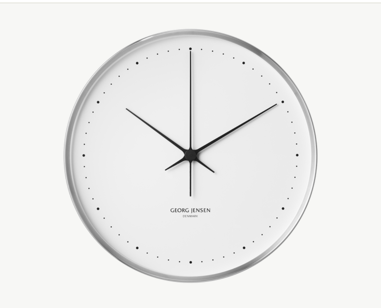 Form and function are brought together perfectly in this truly iconic piece of Scandinavian design. Henning Koppel’s original minimalist clock was designed in 1978 but still remains as contemporary and striking as ever with its clear face, beautifully tapered black hands and understated stainless steel case. It makes a stylish addition to any home. The wall clock has a face made from ABS plastic in white with clear black hands and time points. The case is in stainless steel. The internal mechanism is a precision sweep movement that ensures excellent quality, soundlessness and exactness.