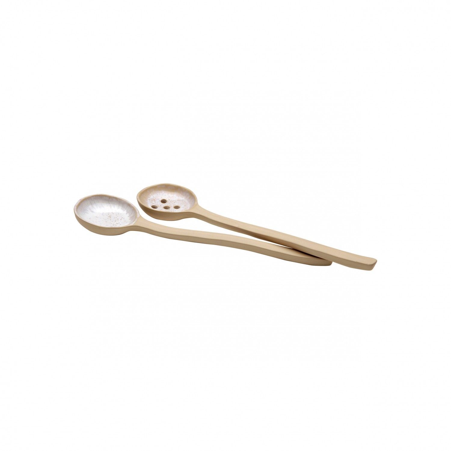 The Casafina Ibiza Salad Server Set is coated with an artful reactive glaze and high-fired to create a unique constellation of milky speckles over solid interiors. The white exterior enhances its minimalist styling, allowing the spectacular interior finish to take center stage. Made in Portugal.