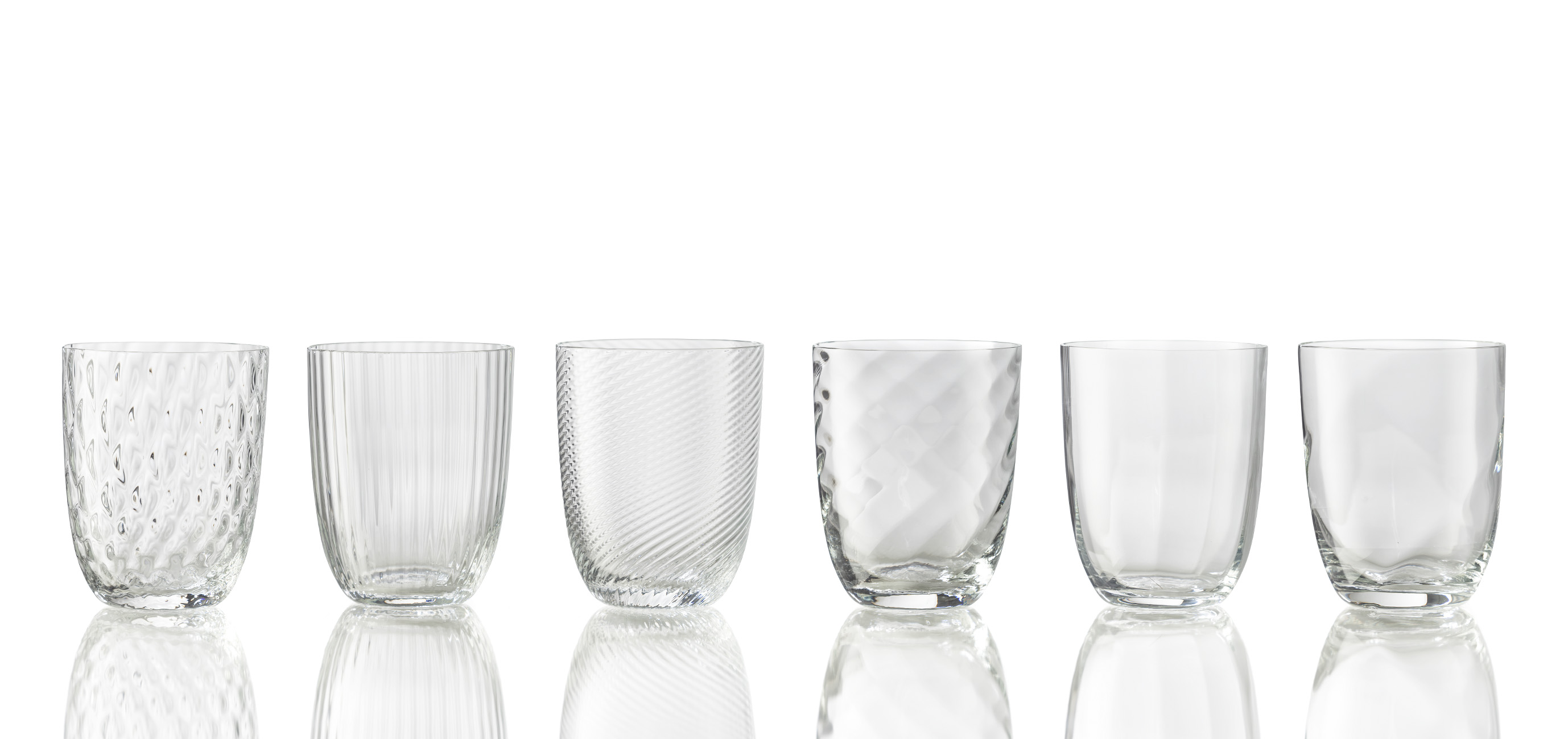 Nason Moretti's mouth-blown Idra collection of six tumblers marries traditional Murano glassblowing techniques with a contemporary aesthetic. The set includes 6 assorted glasses in clear.