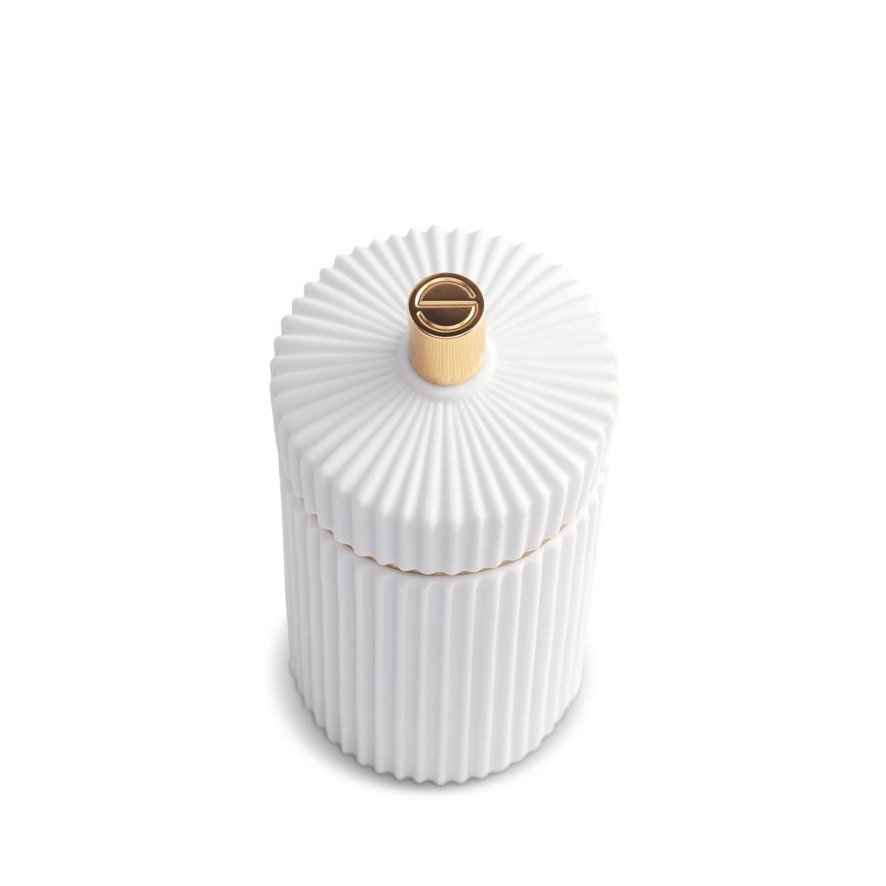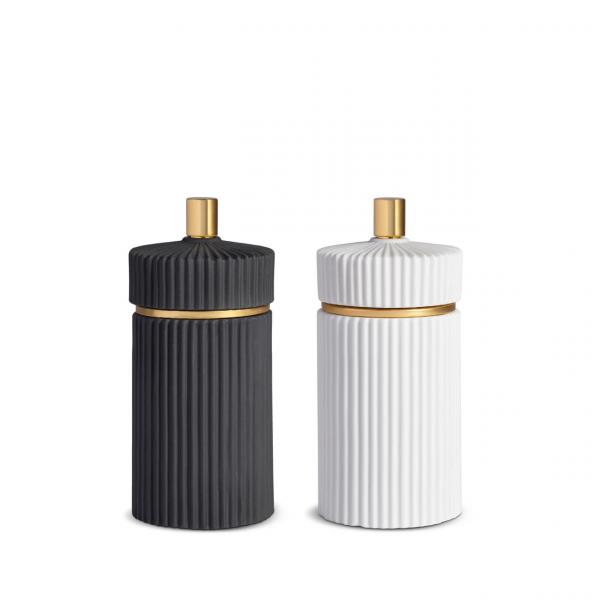L’OBJET + Peugeot collaborated to create luxurious table accents outfitted with expertly functional salt + pepper grinding mechanisms. Inspired by the Ionic order of classical architecture, this collection is crafted from black and white Limoges porcelain in a fluted vertical design, and accented with brass for a touch of opulence. The Peugeot mechanism is made of steel specially treated to keep the teeth razor sharp, and to release maximum flavor and aroma while grinding.