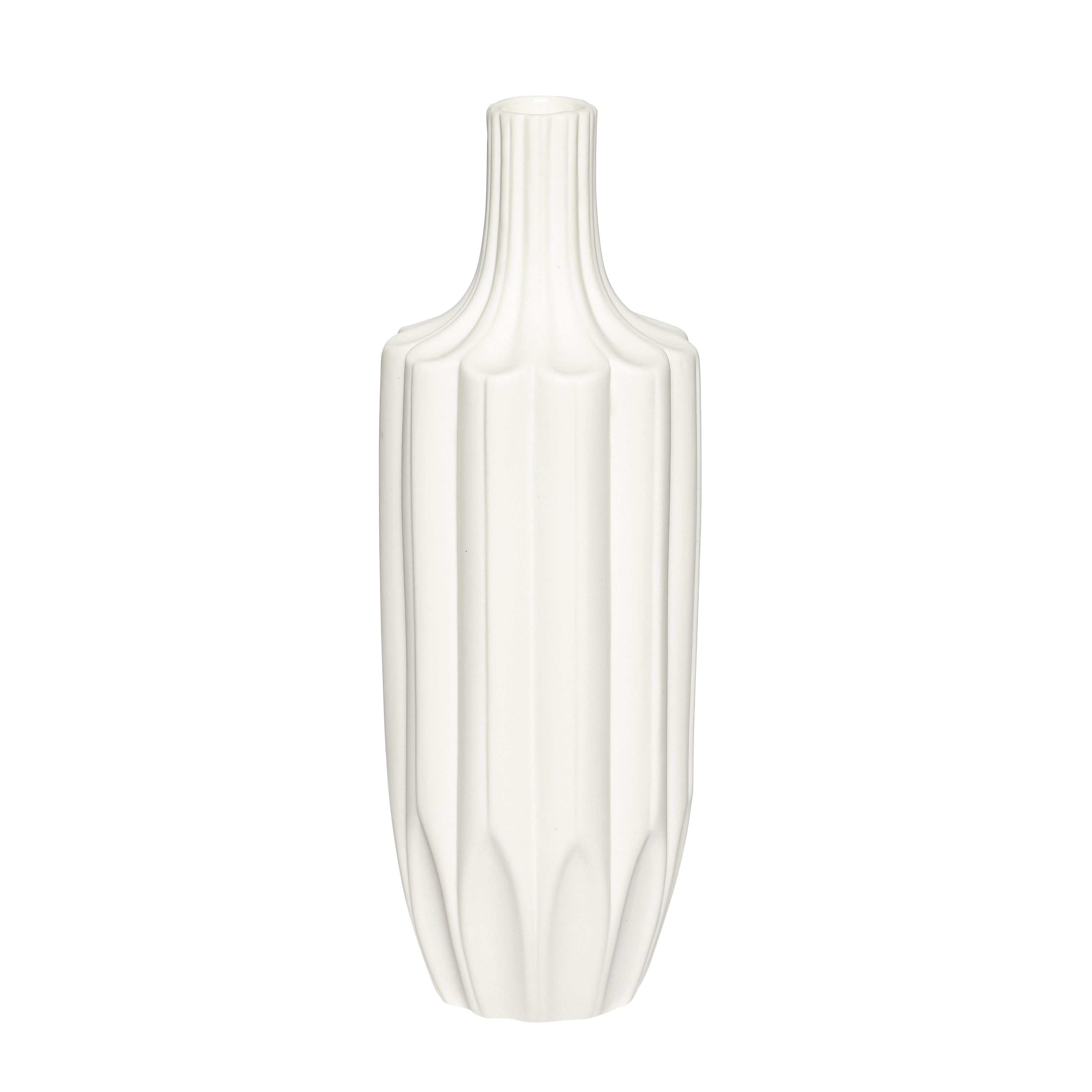 White ceramic vase with fluted detailing.