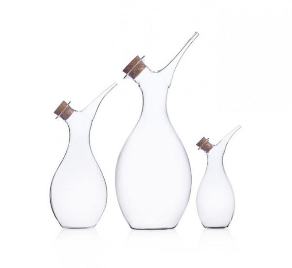 A sinuous glass form inspired by nature. In her Liquid Sense Oil and Vinegar Bottles, designer Rianne Koens translates the curvaceous and organic forms found in nature into a glass and cork accessory for the tabletop. Each with a different size, the oil and vinegar bottles were inspired by the cultural importance of oil in Turkish culture. Each bottle can be used in two ways: either to add an ample pour of oil through the large opening or a small sprinkle through the narrow opening. The large opening can be plugged with the cork stopper. Designed for Ichendorf Milano, the bottles are the result of nearly a century of research and advancements in the company's glassmaking facility. Mouth-blown, the Liquid Sense Oil and Vinegar Bottles resemble a branch growing and are the perfect addition to the tabletop.
