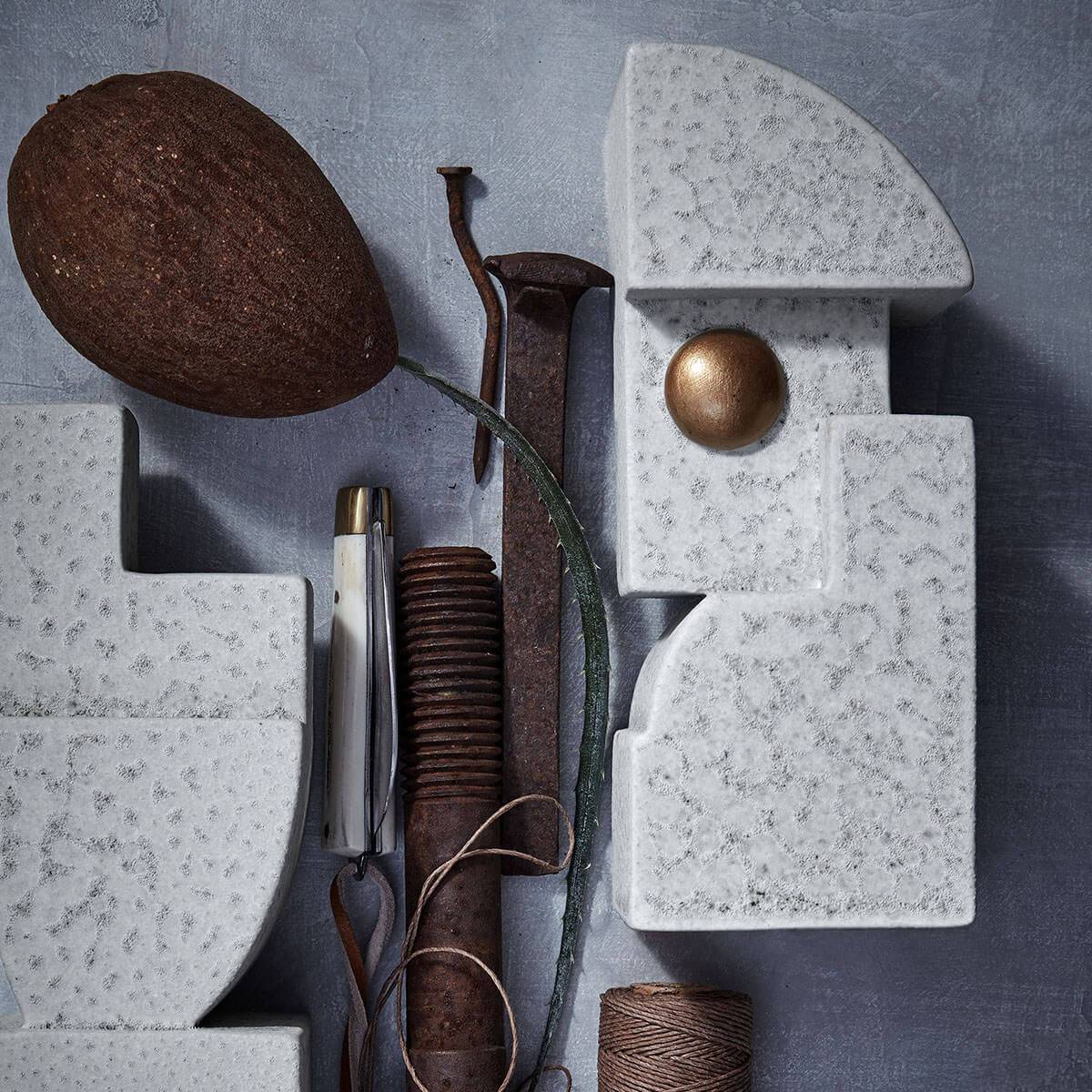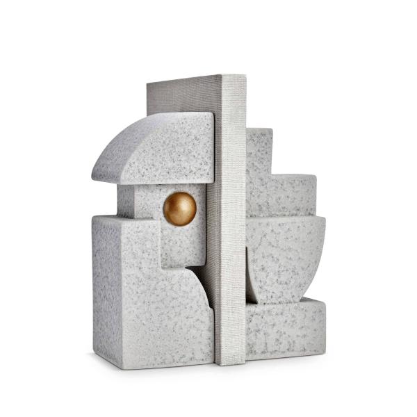 With a nod to both cubist art and Mayan carving, Cubisme takes geometric simplicity to a new level. Bowls and candlesticks are created from lightly textured earthenware. Bookends feature antiqued gold accents. Cheese knife is 100% brass.