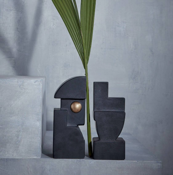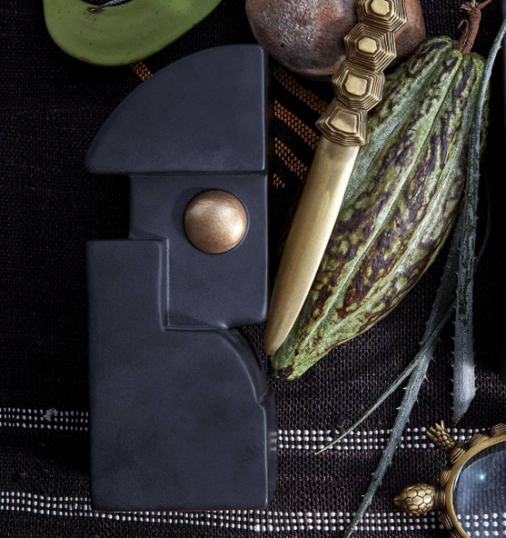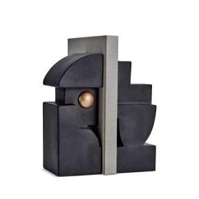 With a nod to both cubist art and Mayan carving, Cubisme takes geometric simplicity to a new level. Bowls and candlesticks are created from lightly textured earthenware. Bookends feature antiqued gold accents. Cheese knife is 100% brass.