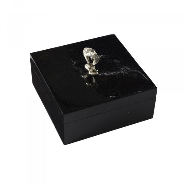 This romantic square box made of black pen shell features two fish embracing each other. This versatile piece is large enough to hold jewelry and other keepsakes or serve as a striking desk accessory.
