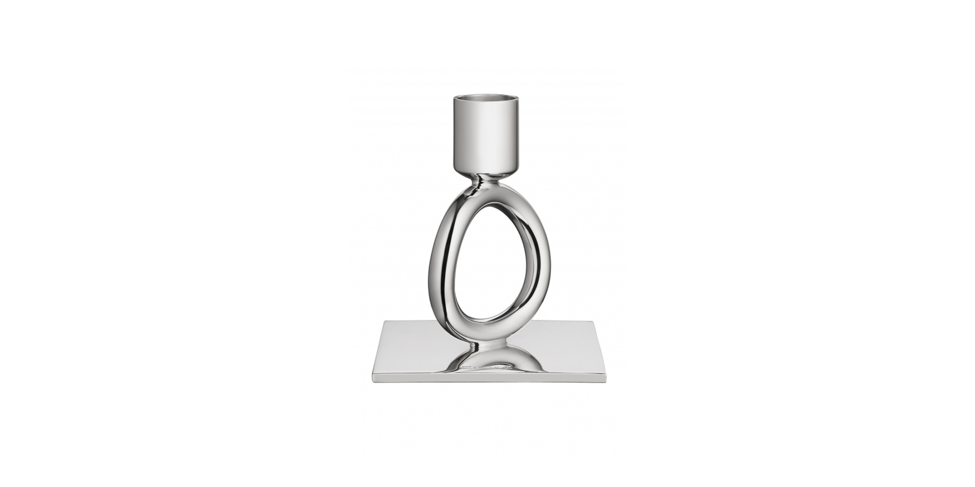 The silver plated Vertigo single-ring candlestick, which holds a single taper candle adds modern and playful elegance to any room. Also comes in taller multiple-ring versions. Vertigo’s bold motif — a subtly asymmetrical, thick ring often placed playfully askew — can be found on every piece in the collection designed by Andrée Putman.