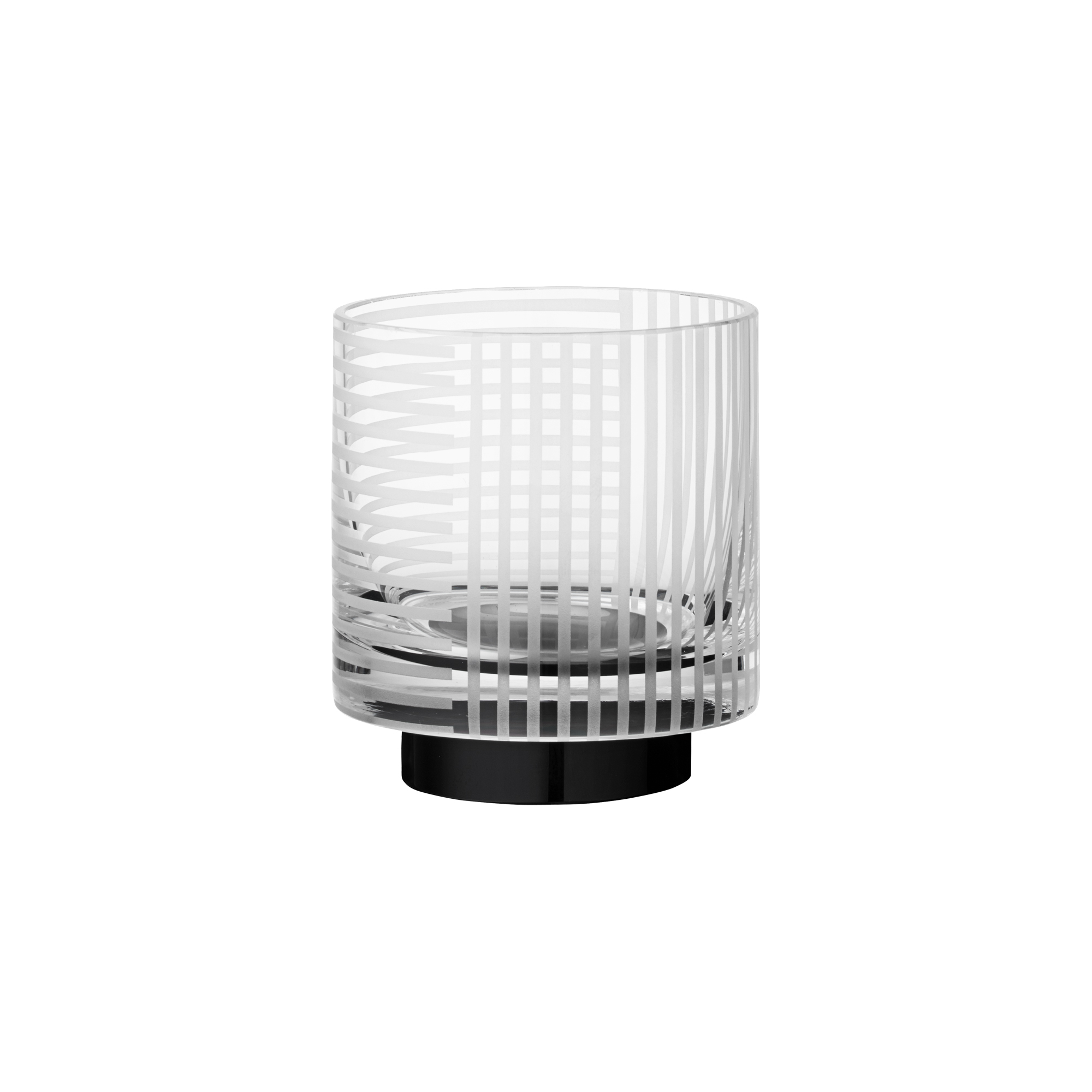 Delightful Vitreus designs in crystal glass and with hints of art deco style. This cylinder shape is made interesting with a black glass base and a sandblasted pattern that creates beautiful effects with tealights inside.