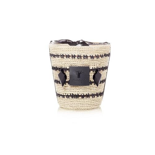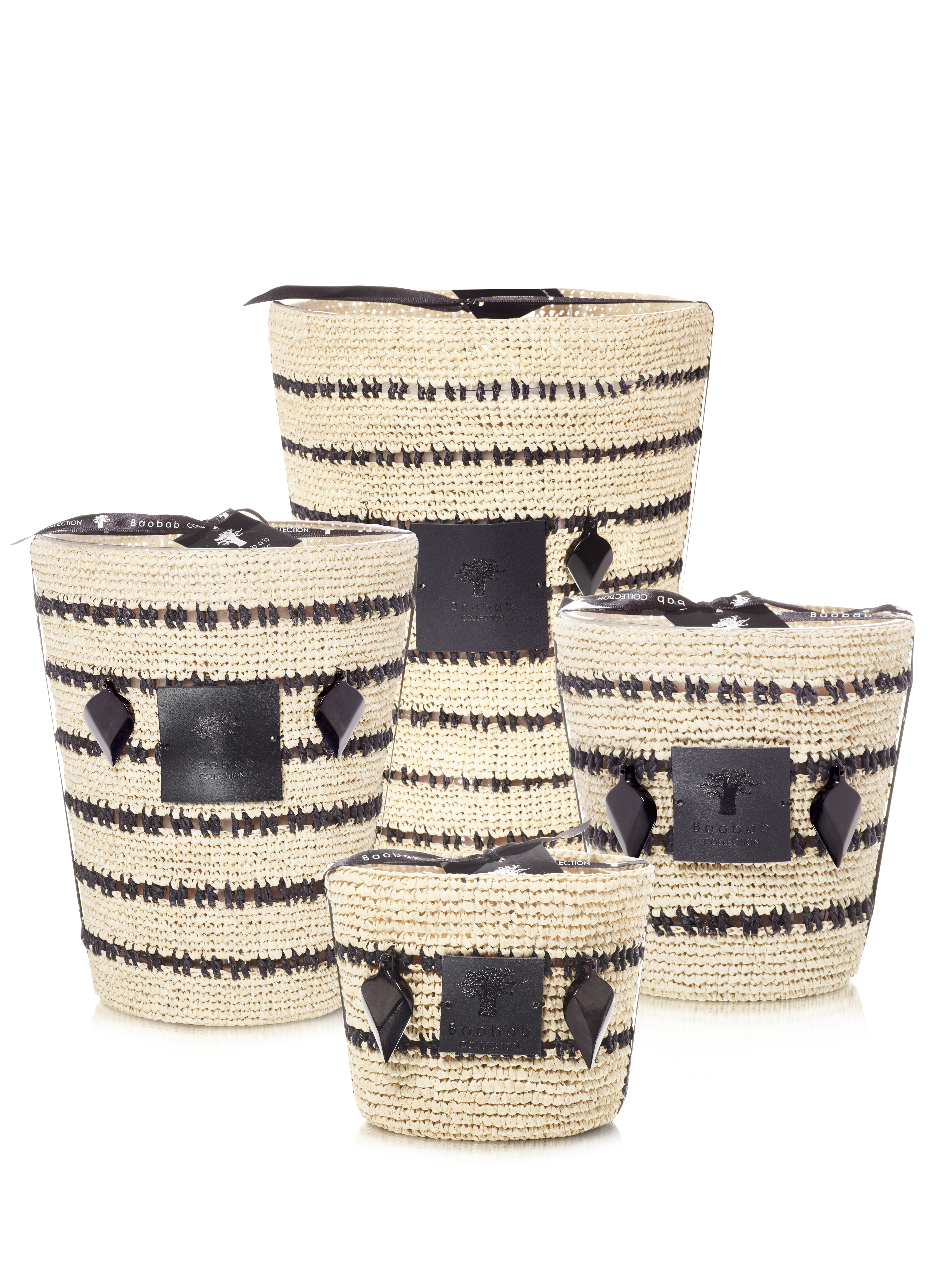 The Manou candle is covered in natural raffia with small black insertions that resemble seeds. This open motif brings a touch of transparency whilst staying true to the collection’s tribal aesthetic. The two sculpted small black horns reference the warrior traditions that the candle was inspired by.