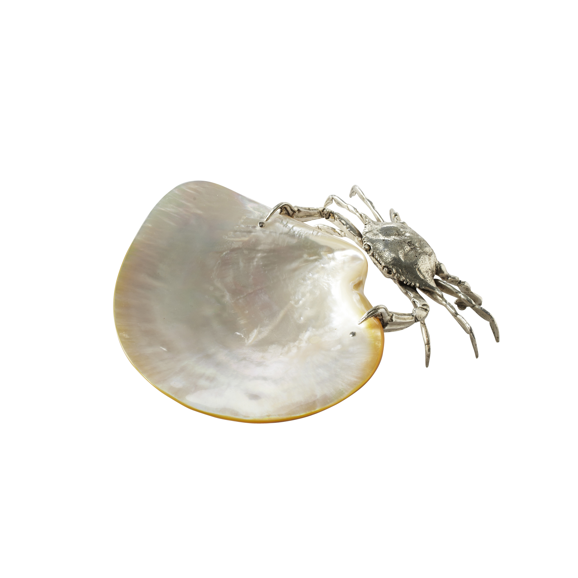 This exquisite decorative piece features a silver plated crab grasping a mother-of-pearl shell. The contrast between silver and the natural ivory tones of the shell will add subtle shimmer to bookshelves, dressers and tabletops.