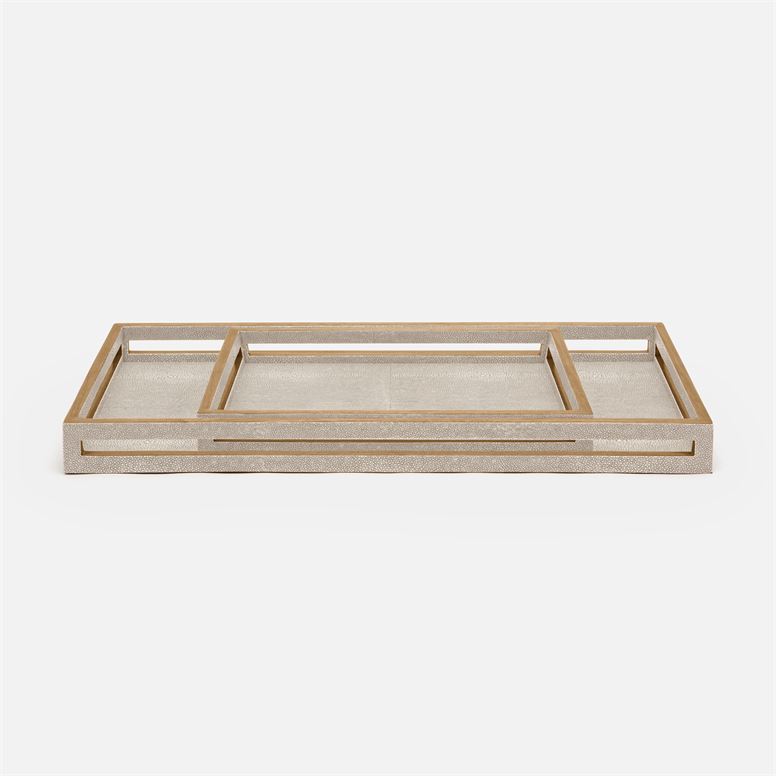 Long, narrow tray—perfect for a console or vanity—finished in our faux shagreen with open-sided, wood-trimmed handles, creating an airy look.