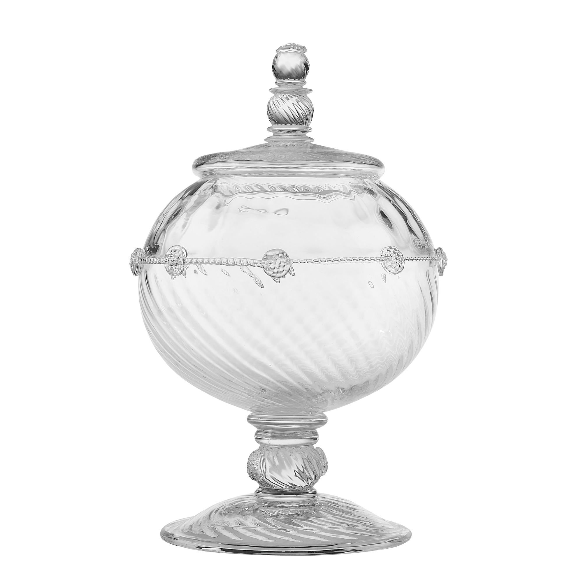 Exquisitely sculptural, this functional piece brings a dose of glamour to your mantle, tabletop or kitchen counter. A rotund silhouette is adorned with a string of berries upon optic glass for a hint of sparkle. A must have for the tastemakers cache.