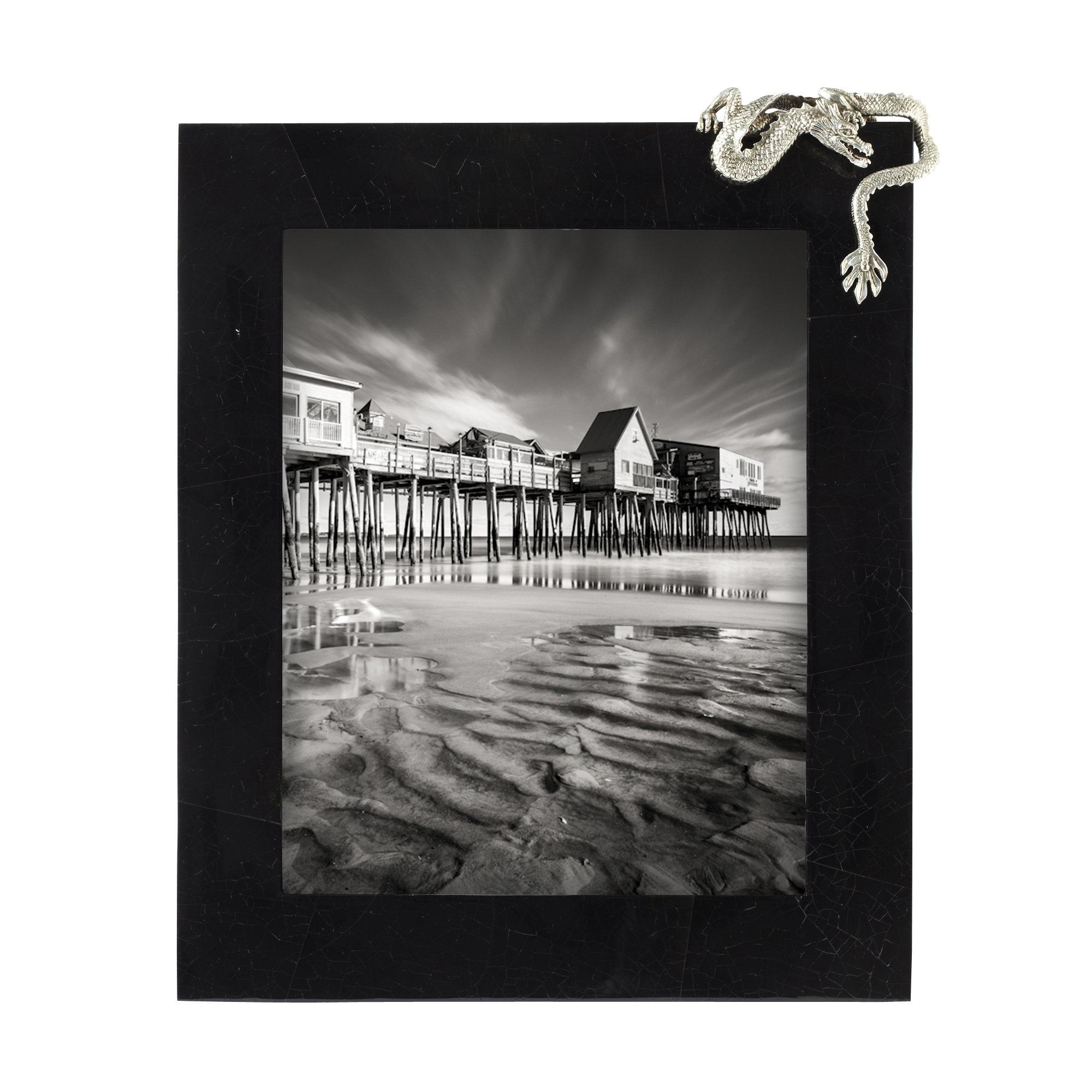 This elegant picture frame made of black pen shell features a crouching dragon on one of its corners. The charismatic dragon promises to keep your favorite family photo safe and sound.