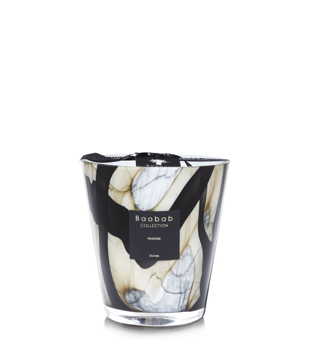 The scented candle is set in a hand blown glass replicating grey marble with black strokes edged with beige. The elegance of the glass reveals the flame, giving an effect of a luminous stone.